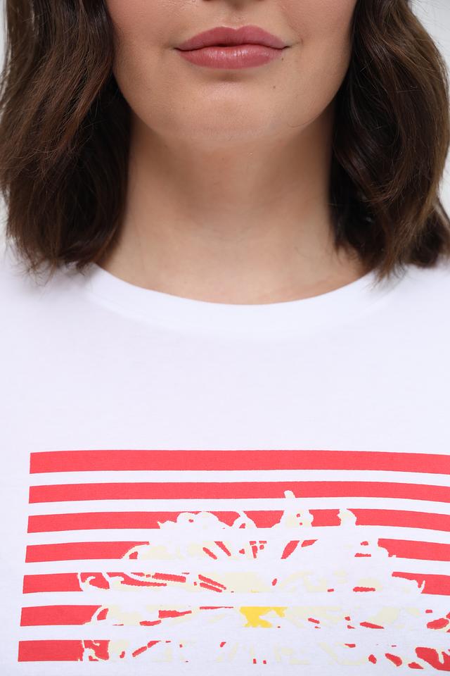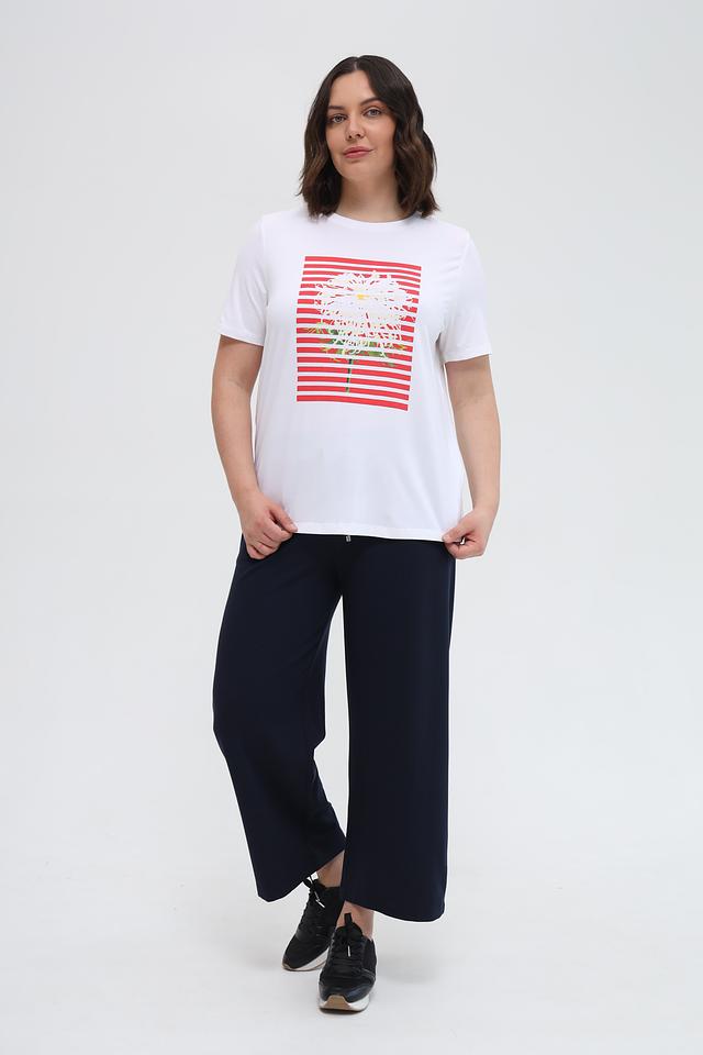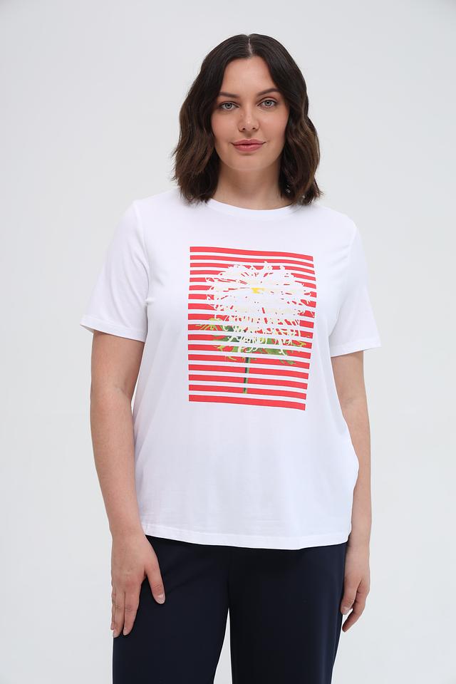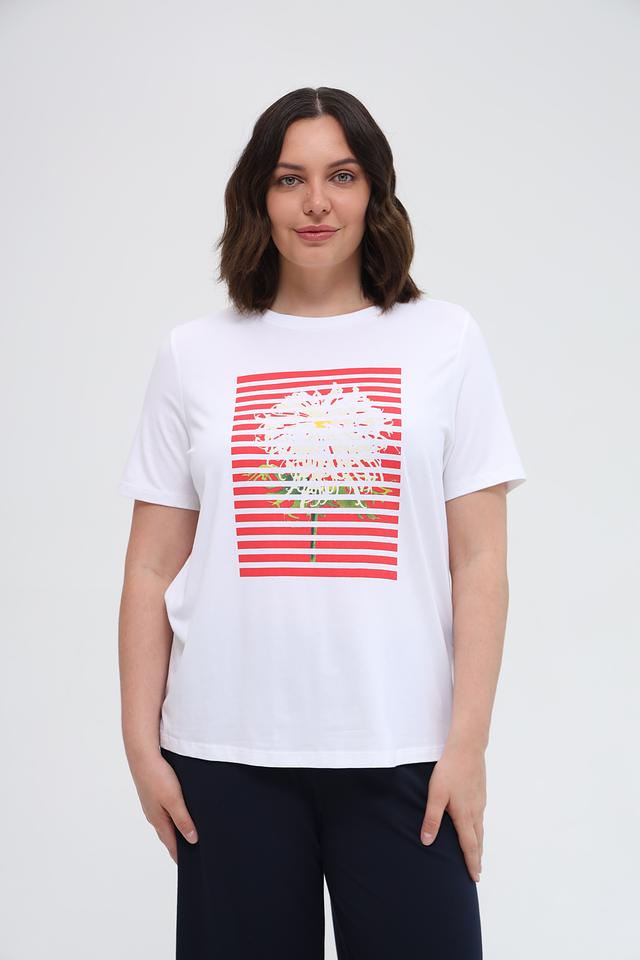 Белая футболка Samoon с ярким принтом в красную полоску. Модель свободного кроя выполнена из мягкого и приятного к телу модала с добавлением хлопка и эластана. Состав: модал 50%, хлопок 45%, эластан 5%
