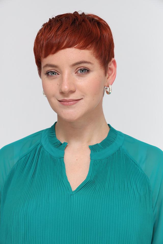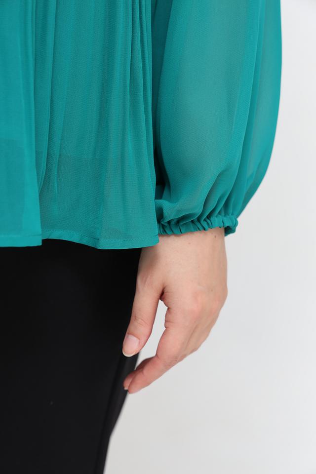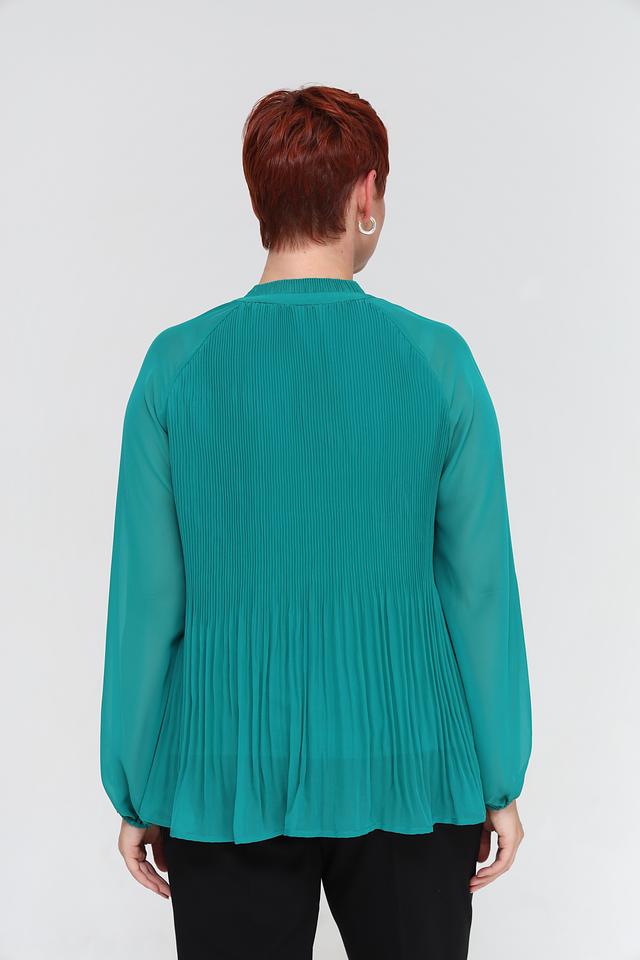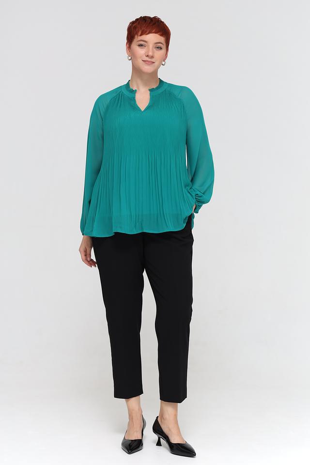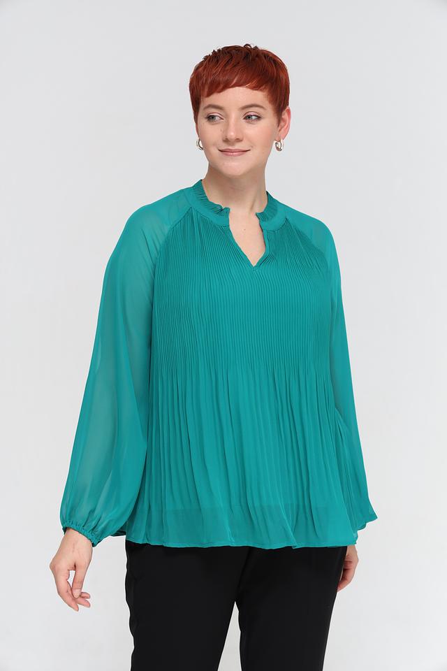 Блуза имеет приятный изумрудный цвет и эффектную плиссированную текстуру, которая добавляет образу изысканности. V-образный вырез и длинные рукава делают ее универсальной для различных случаев.