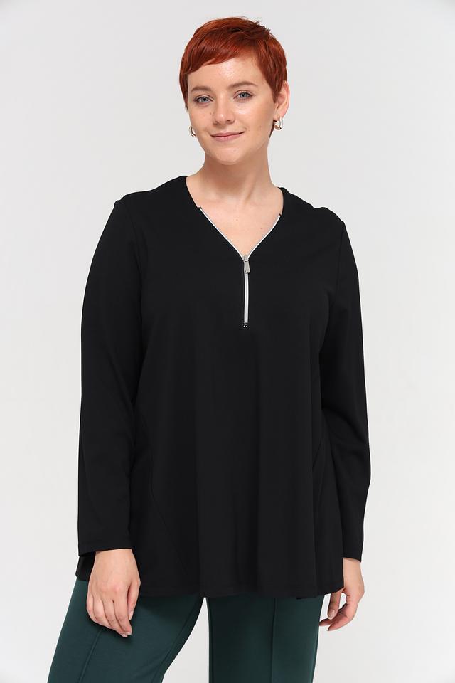 Чёрный пуловер Samoon с V-образным вырезом и короткой молнией. Изготовлен из мягкой вискозы с добавлением полиамида и эластана для комфорта и хорошей посадки. Состав: вискоза 60%, полиамид 35%, эластан 5%