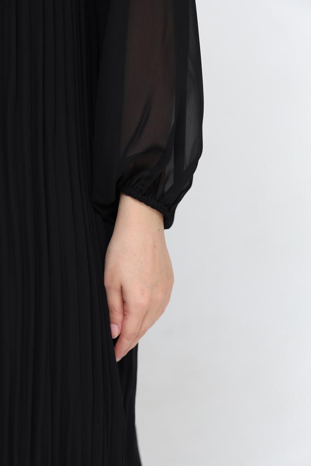 Особенностью этого платья является его крой: плиссированная юбка придает образу легкость и воздушность, а полупрозрачные рукава-фонарики добавляют романтичности. Вырез горловины оформлен небольшими завязками, которые можно регулировать по своему вкусу.