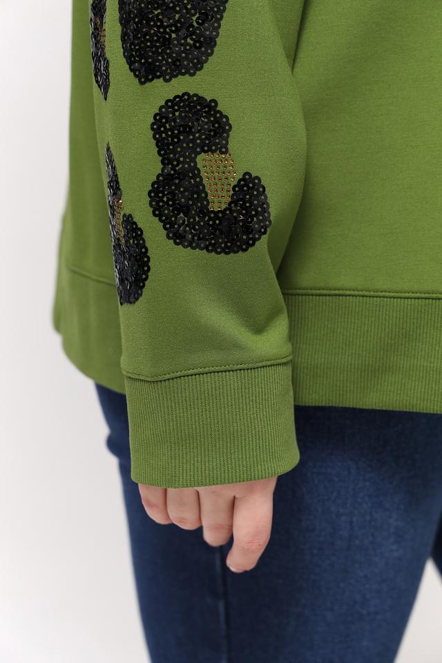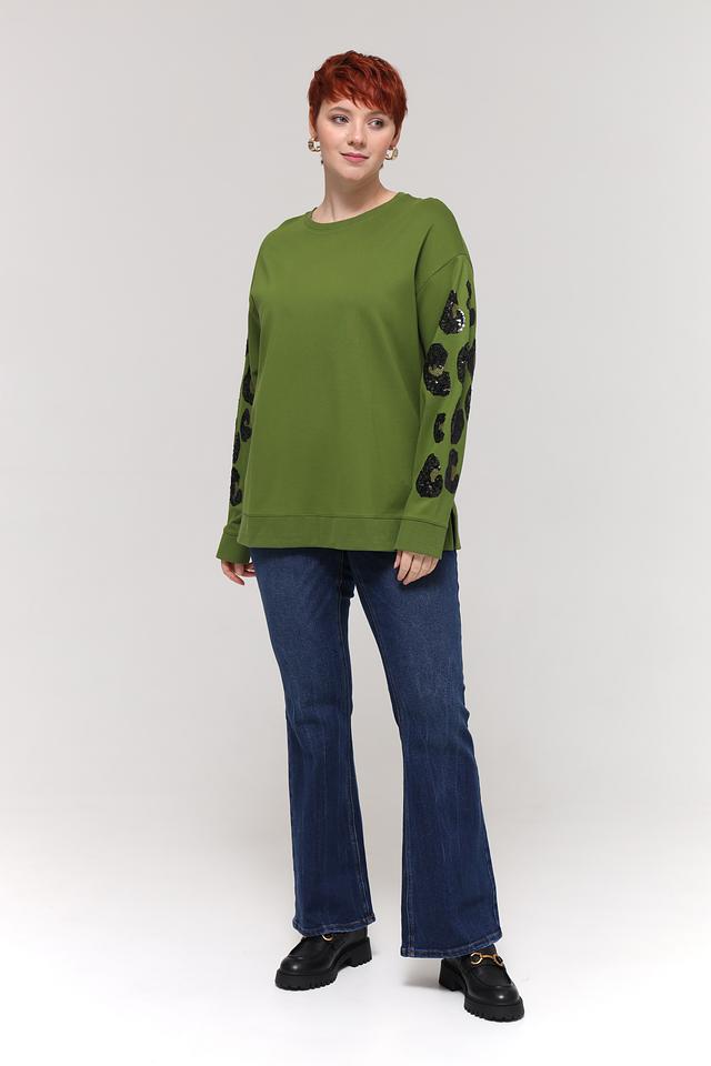 Особенностью данной модели является декор на рукавах – эффектный леопардовый принт, который добавляет образу динамичности и оригинальности. Пуловер имеет круглый вырез горловины и длинные рукава.