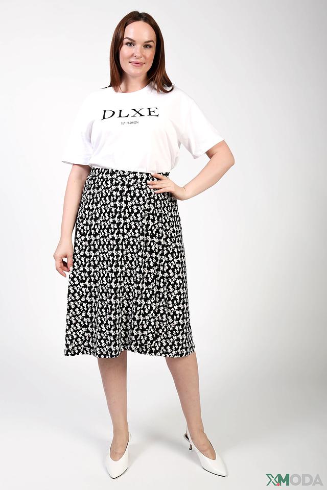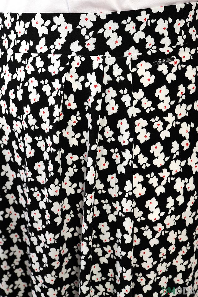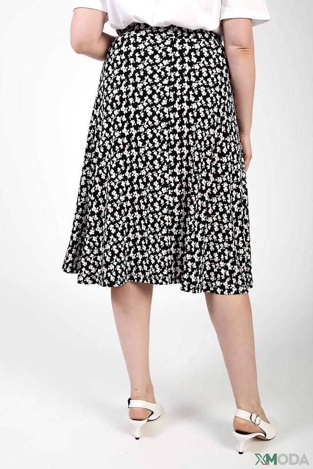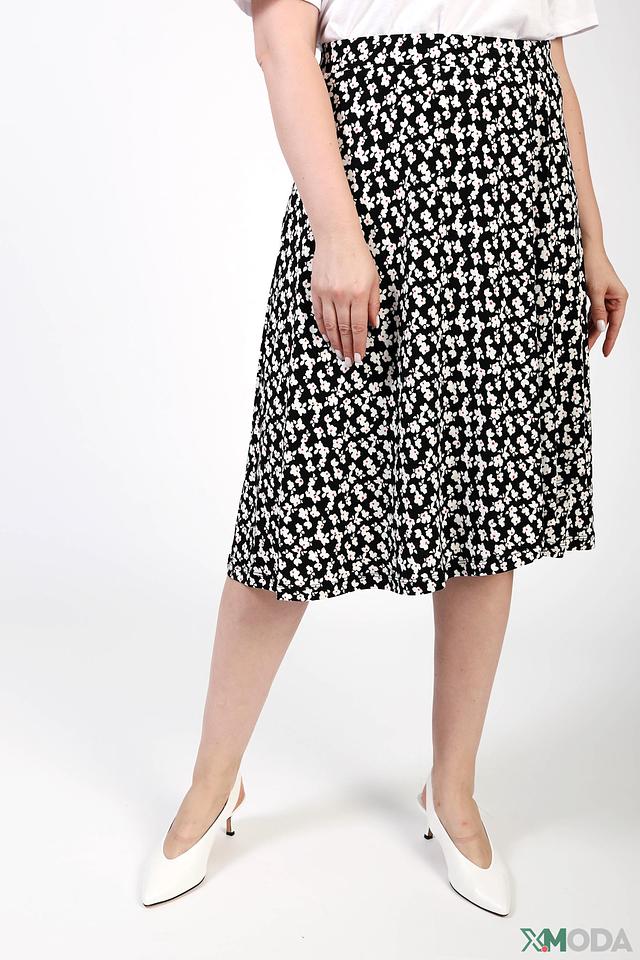Юбка имеет классическую длину миди и прямой крой, который подходит для любого типа фигуры. Чёрный фон юбки украшен мелким цветочным принтом белого цвета, что придает ей романтичный и женственный вид.