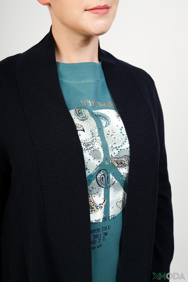 Жакет имеет прямой силуэт, без застежки, что позволяет легко создавать многослойные образы. Текстурная вязка добавляет изделию объём и оригинальность. Длинные рукава и отсутствие воротника делают жакет универсальным и подходящим для различных стилей.