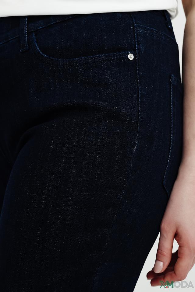 Джинсы имеют прямой крой и стандартную посадку по талии. Отличительной особенностью является наличие манжет на штанинах, что придает образу непринужденный и современный вид. Застежка – молния и пуговица. На задней части джинсов расположены функциональные карманы.