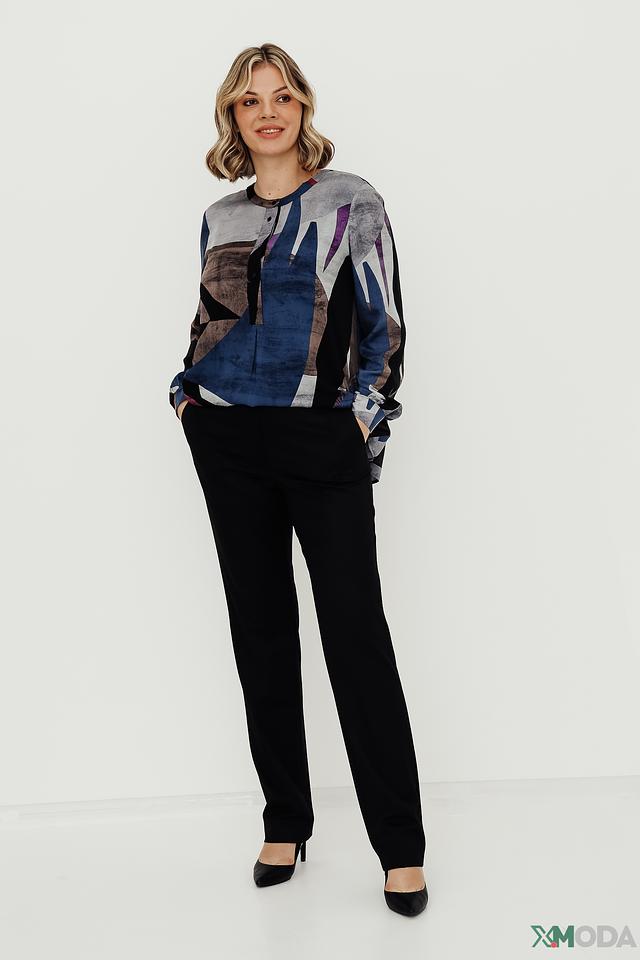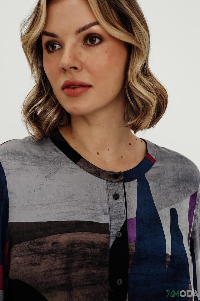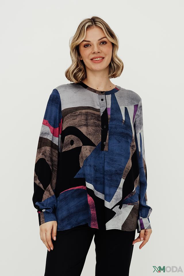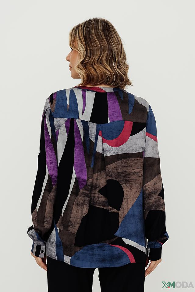 Особенностью данной модели является яркий геометрический принт, выполненный в сочетании синих, серых, коричневых и фиолетовых оттенков. Этот принт делает блузу уникальной и привлекательной. Длинные рукава с манжетами на пуговицах добавляют образу завершенность.