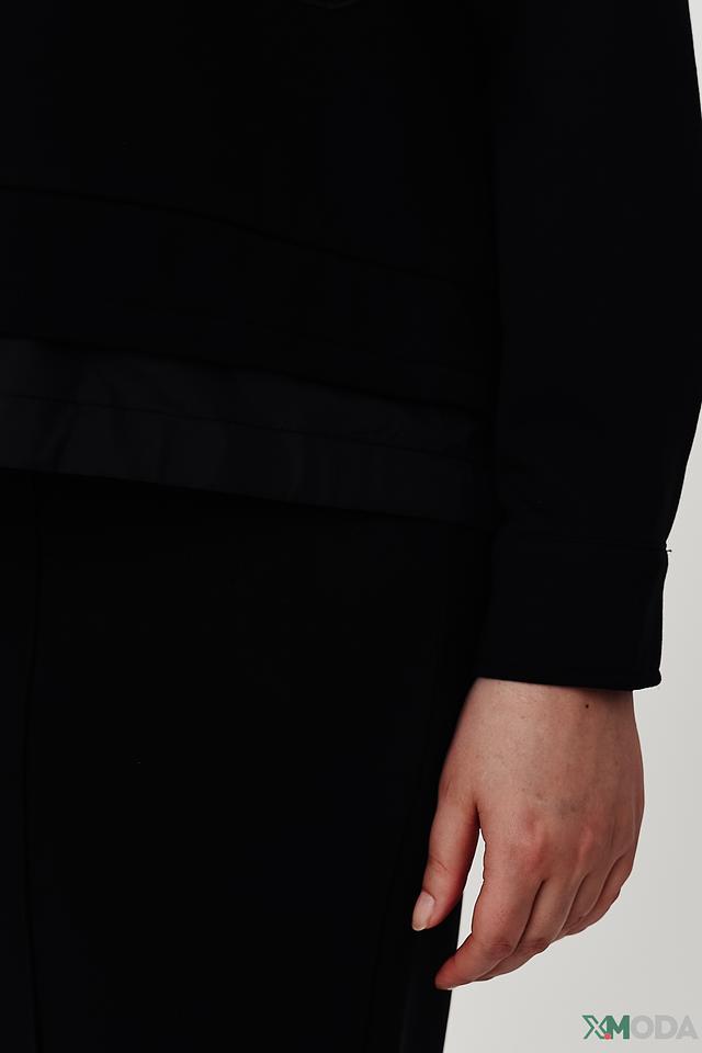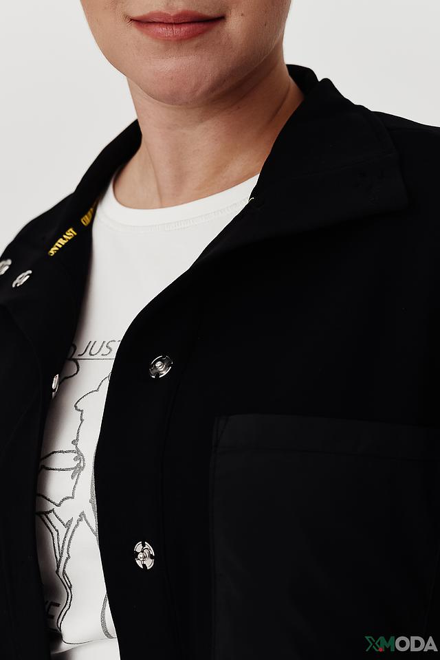 Жакет имеет оригинальный дизайн благодаря контрастным вставкам из гладкой ткани на груди и карманах. Застёжка на пуговицах обеспечивает удобство и надёжность. Длинные рукава и воротник-стойка добавляют образу элегантности.