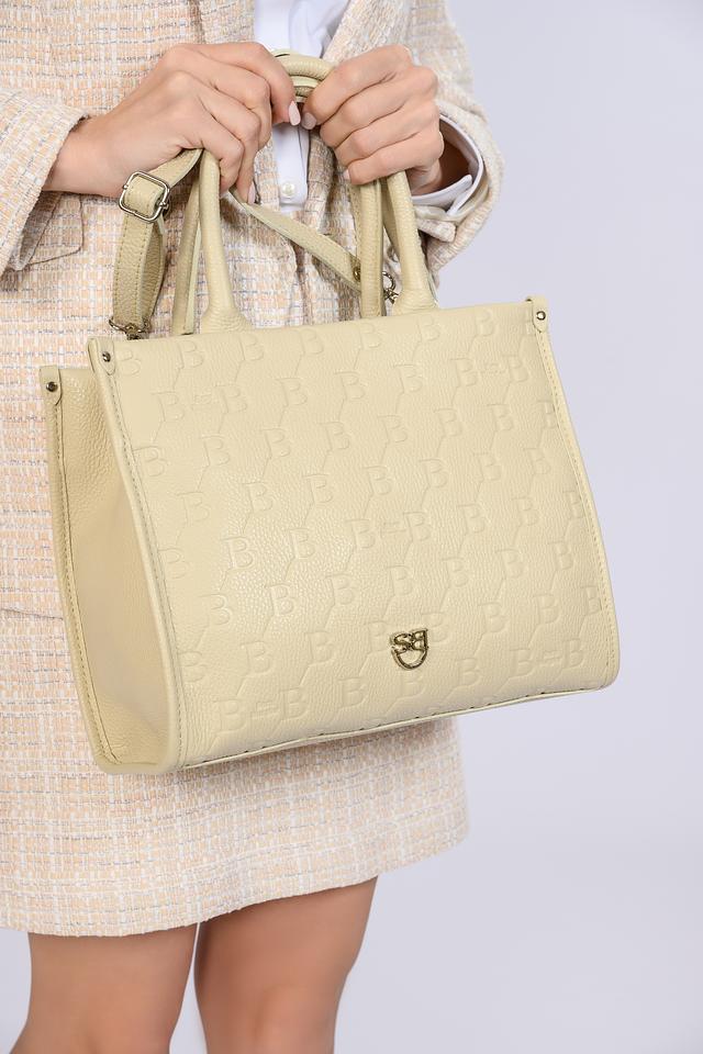 Сумка имеет бежевый цвет и украшена повторяющимся тиснением "BB", что придает ей особый шарм и узнаваемость. Вместительное основное отделение позволяет удобно разместить все необходимые вещи.