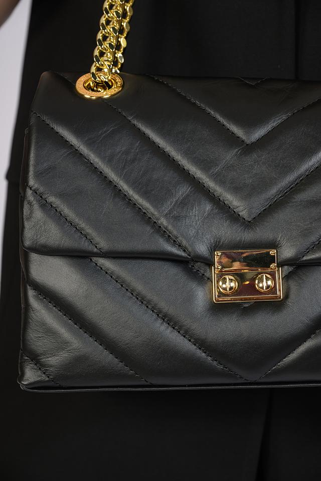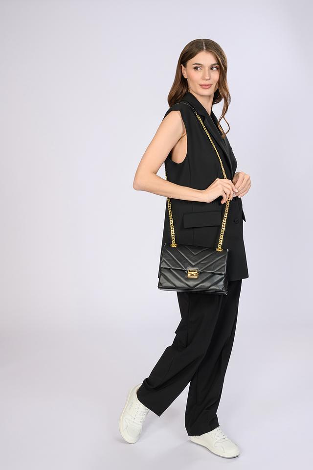 Чёрный цвет и стеганая текстура придают сумке изысканный вид. Золотистая фурнитура добавляет роскоши и блеска. Сумка оснащена удобным цепочным ремешком, который позволяет носить её на плече или через плечо.
