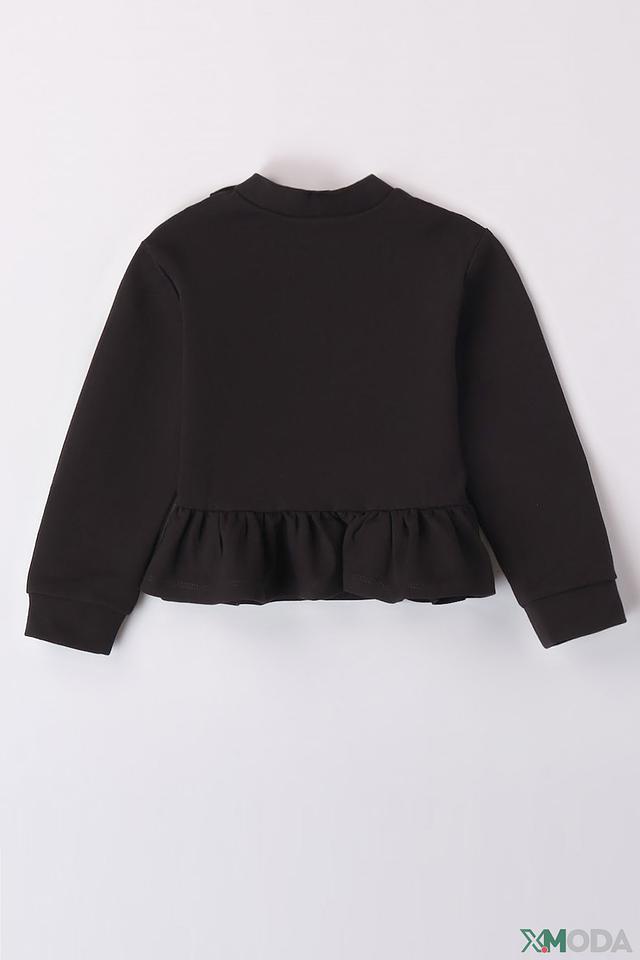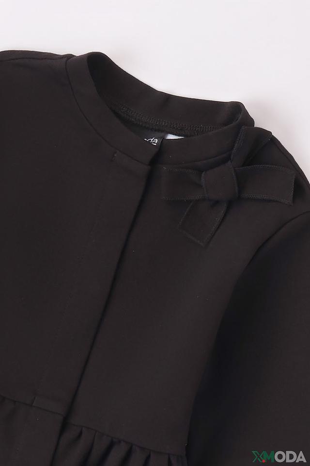 Джемпер выполнен в классическом чёрном цвете, который легко сочетается с другими элементами одежды. Оригинальный бантик на горловине придает образу игривость и очарование. Декоративная оборка по низу добавляет модели изысканности.