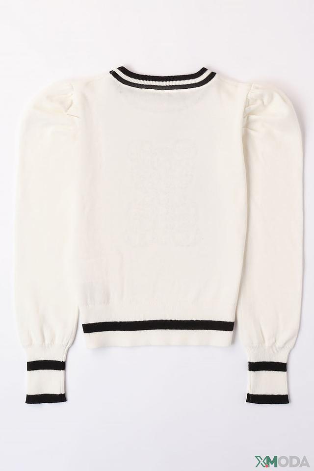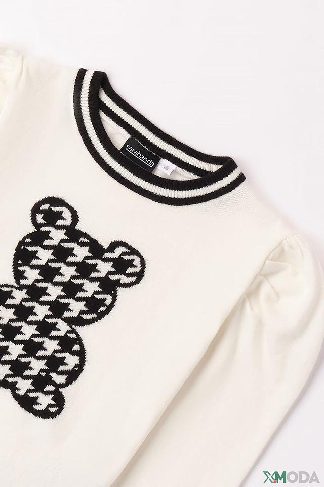 Основной акцент модели – крупный принт медвежонка в классическую черно-белую клетку. Рукава-фонарики придают образу игривость и кокетство. Воротник, манжеты и нижняя кромка отделаны черной полоской, что добавляет контрастности и завершенности.
