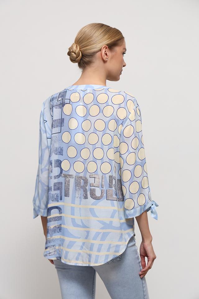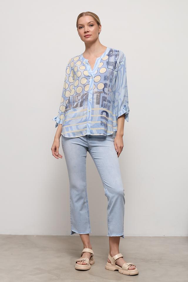 Эта блуза от SE Stenau выполнена из 100% вискозы, что делает ее приятной к телу и легкой в уходе. Преобладающий цвет – голубой, украшенный ярким и необычным принтом, сочетающим в себе геометрические фигуры и абстрактные элементы в бежевых и желтых тонах.