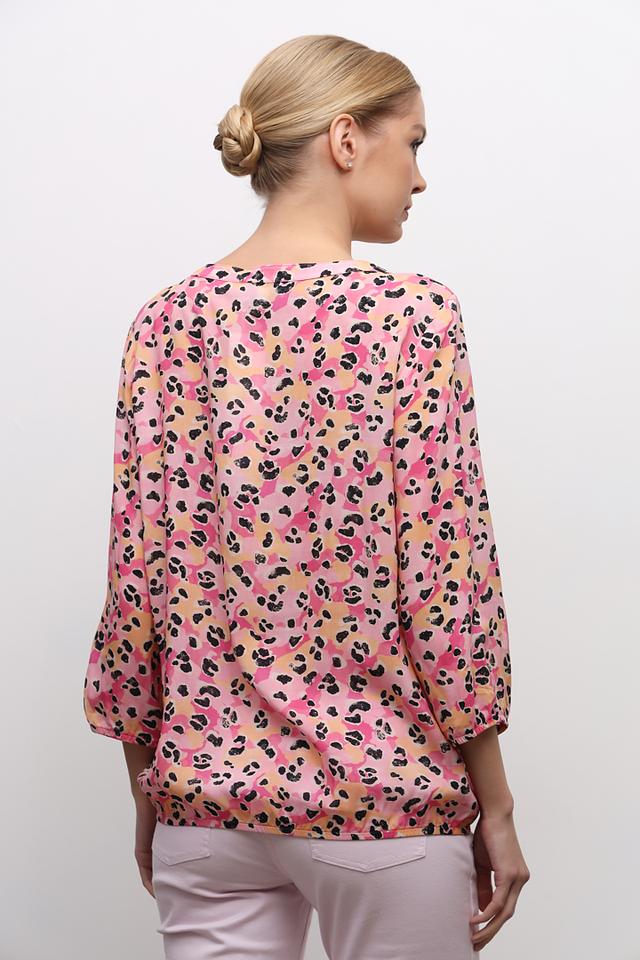 Особенностью данной модели является оригинальный леопардовый принт в розово-оранжевой гамме. Блуза имеет округлый вырез горловины и рукава длиной 3/4 с небольшими сборками по краям, что придает ей романтичный вид.
