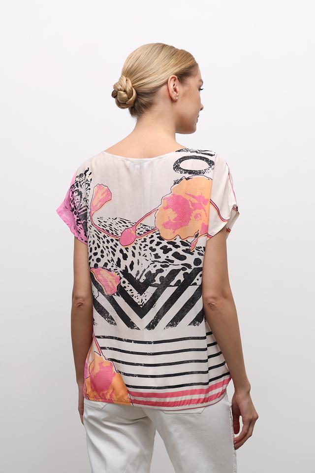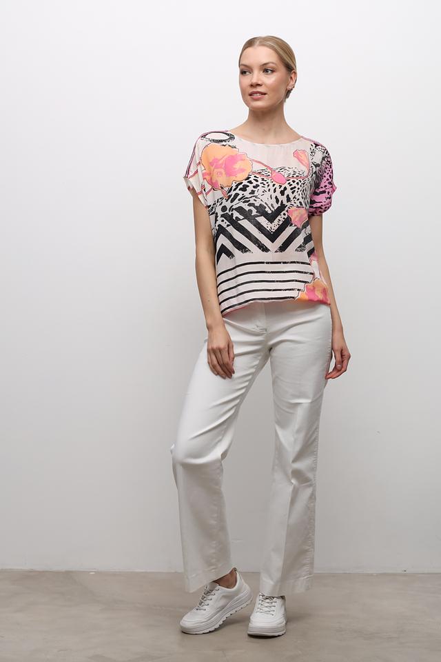 Особенностью данной модели является оригинальный принт, сочетающий в себе абстрактные элементы, геометрические фигуры и цветочные мотивы в розово-чёрно-белой гамме. Круглый вырез горловины и короткие рукава делают блузу универсальной и подходящей для различных случаев.