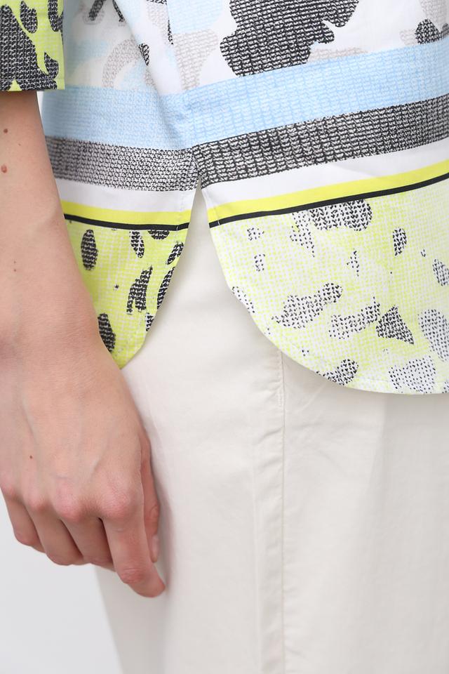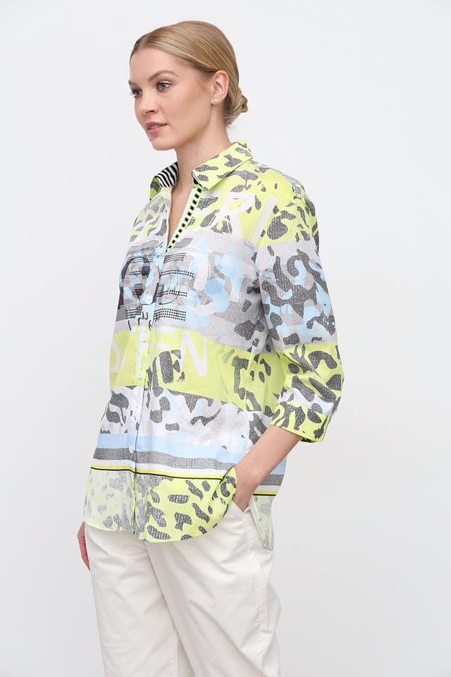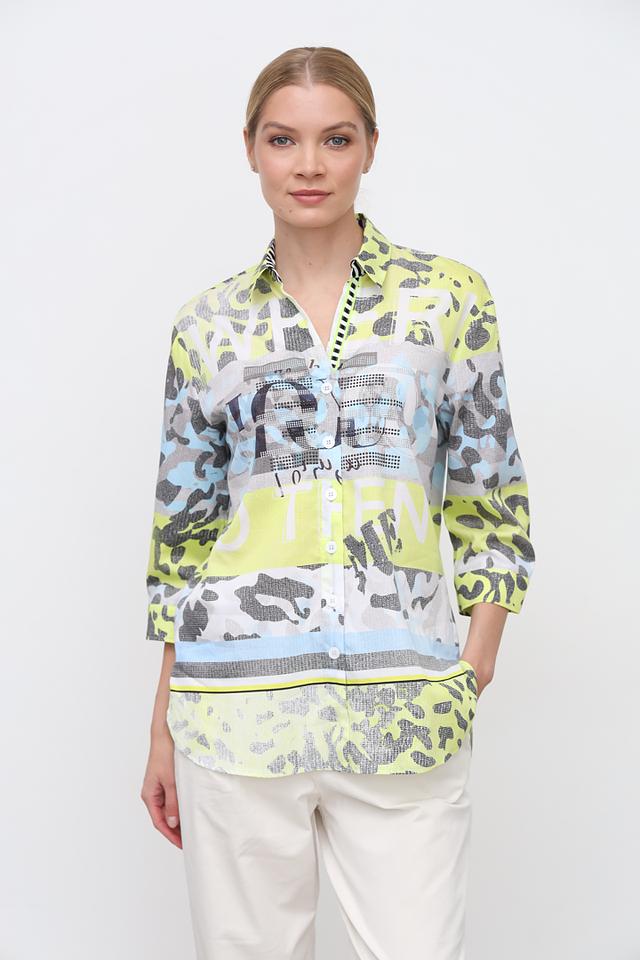 Особенностью данной модели является яркий и необычный принт, сочетающий в себе оттенки лайма, голубого, серого и белого. Этот принт добавляет блузе оригинальности и позволяет выделиться из толпы.