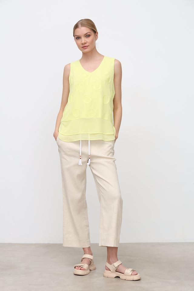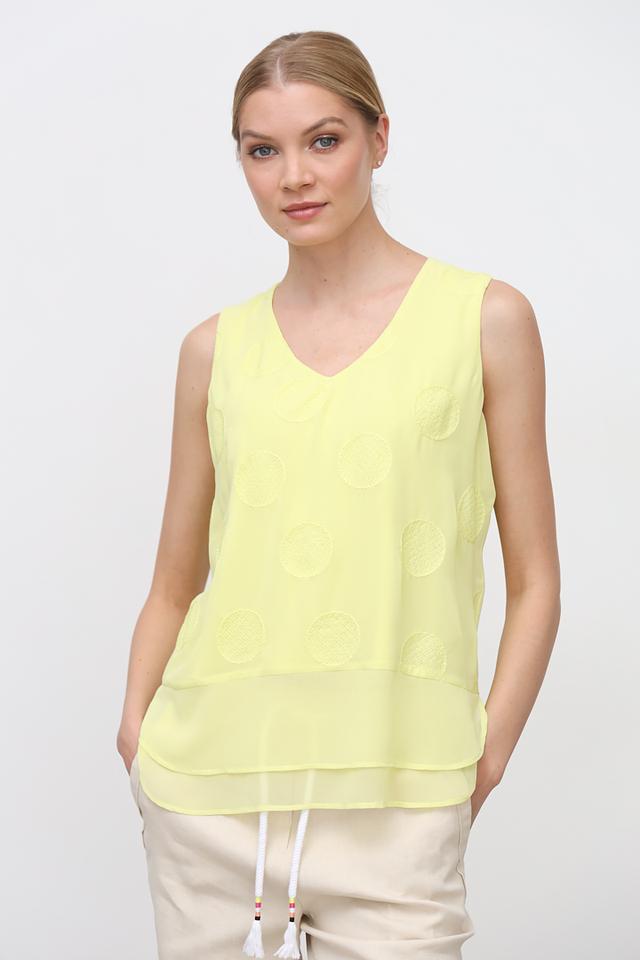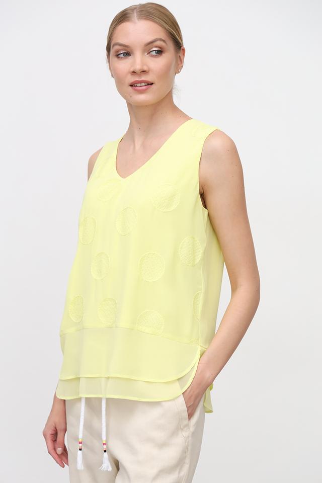 Топ имеет свободный крой и двухслойную конструкцию, верхний слой украшен принтом в виде кругов. V-образный вырез горловины и отсутствие рукавов делают этот топ идеальным выбором для тёплой погоды.