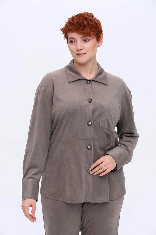 Рубашка имеет классический крой с длинными рукавами и застежкой на пуговицы. На груди расположены накладные карманы, добавляющие образу непринужденность.