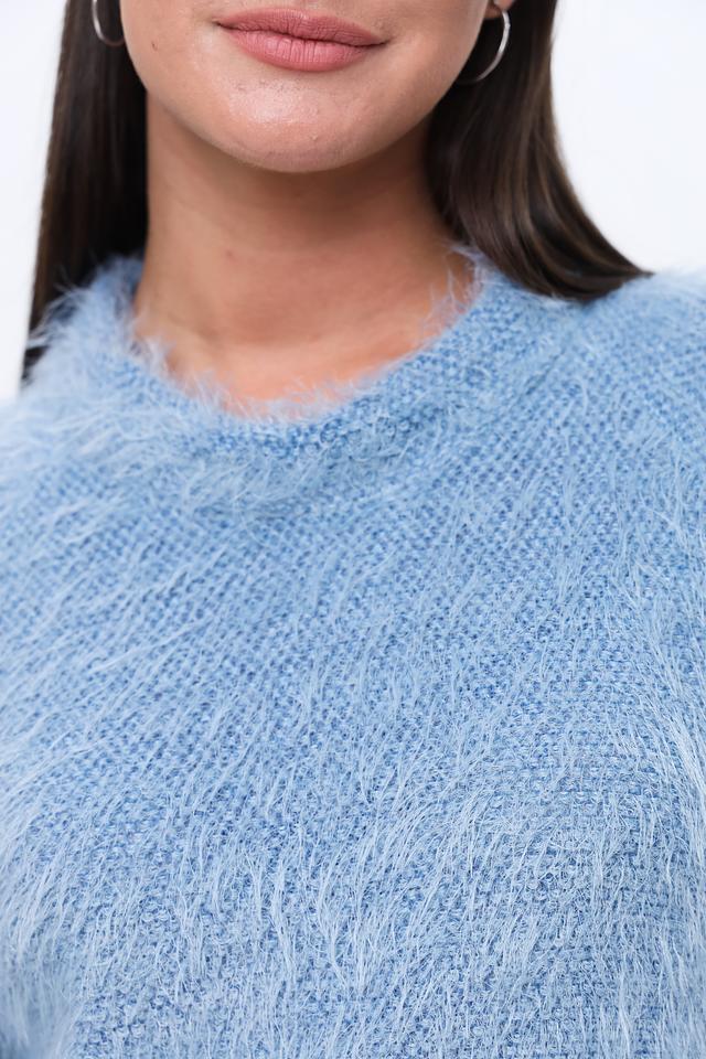 Пуловер имеет нежный голубой цвет и фактурную, "пушистую" вязку, которая придает ему особый шарм. Округлый вырез горловины и свободный силуэт делают его универсальным и подходящим для различных стилей.