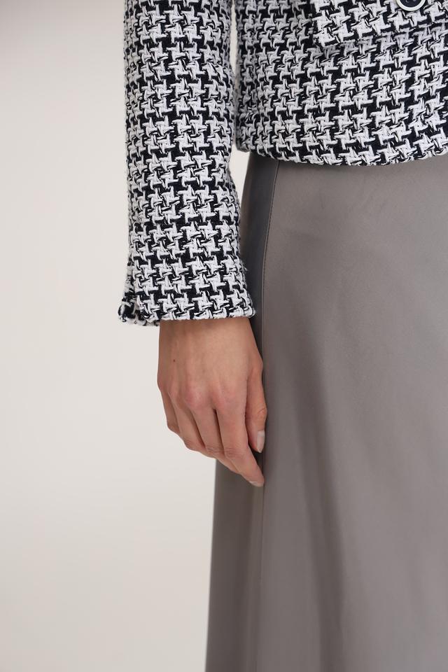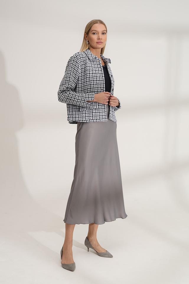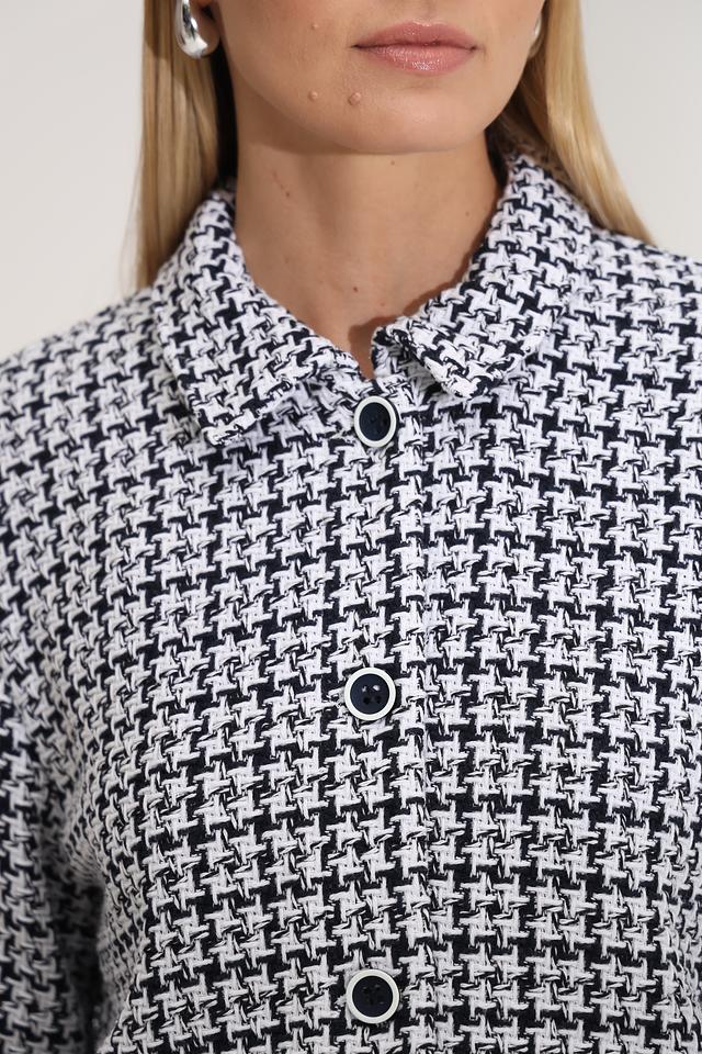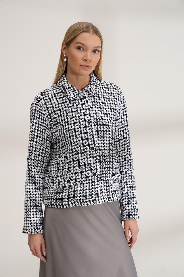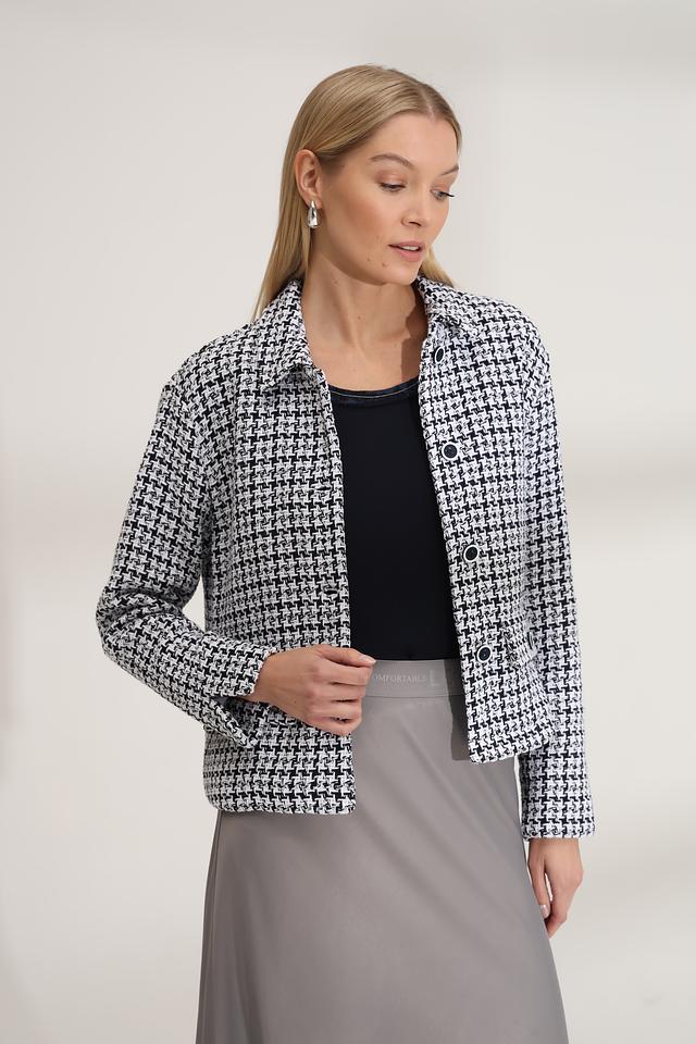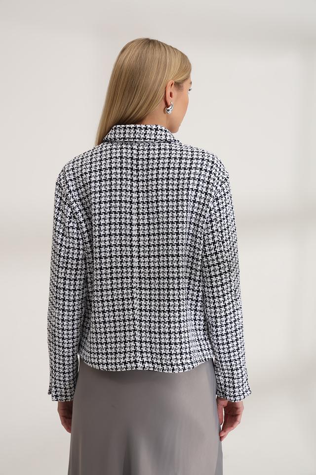Основной цвет жакета – чёрно-белый, с характерным рисунком "гусиная лапка", который придает ему элегантность и изысканность. Жакет выполнен из высококачественного материала, состоящего из хлопка (70%), полиэстера (25%) и эластана (5%). Такое сочетание обеспечивает комфорт в носке, устойчивость к сминанию и хорошую посадку по фигуре.