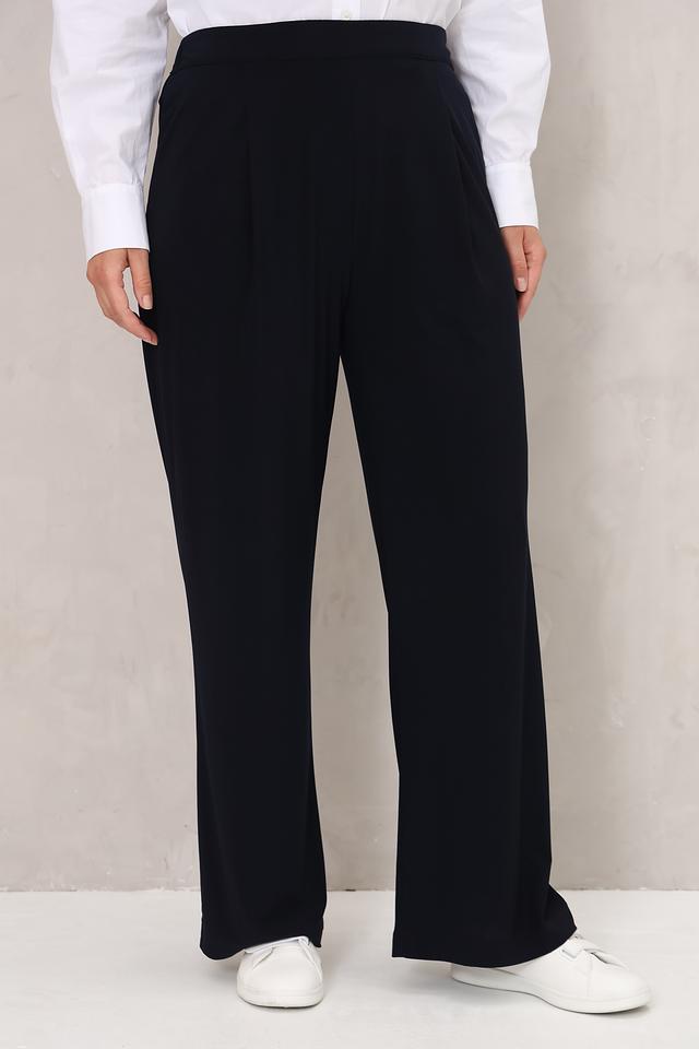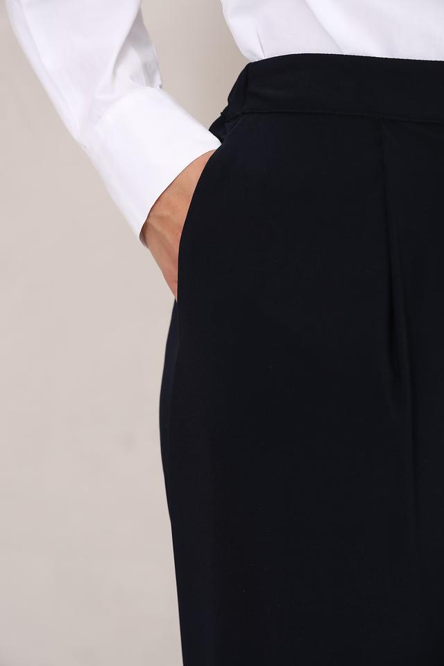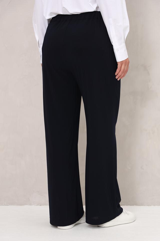 Брюки имеют высокую посадку и эластичный пояс, что обеспечивает комфортную посадку и подчёркивает талию. Крой клёш визуально удлиняет ноги и придает образу женственность.