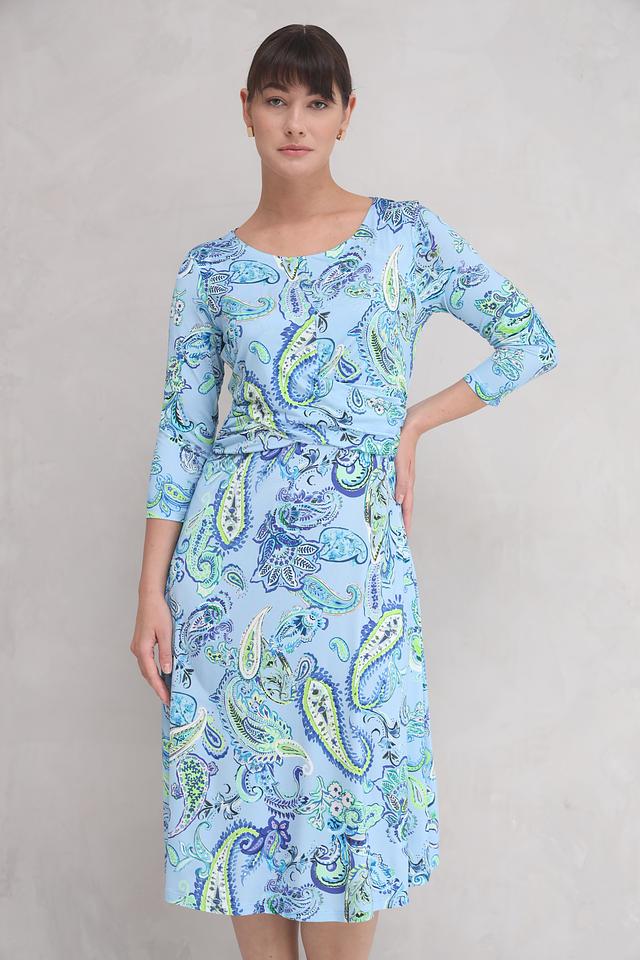 Это стильное платье от бренда SE Stenau выполнено в нежном голубом цвете и украшено оригинальным принтом пейсли. Платье имеет длину миди и приталенный силуэт, который подчеркивает достоинства фигуры.