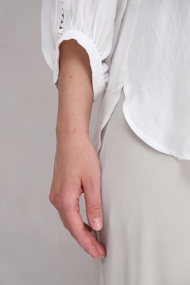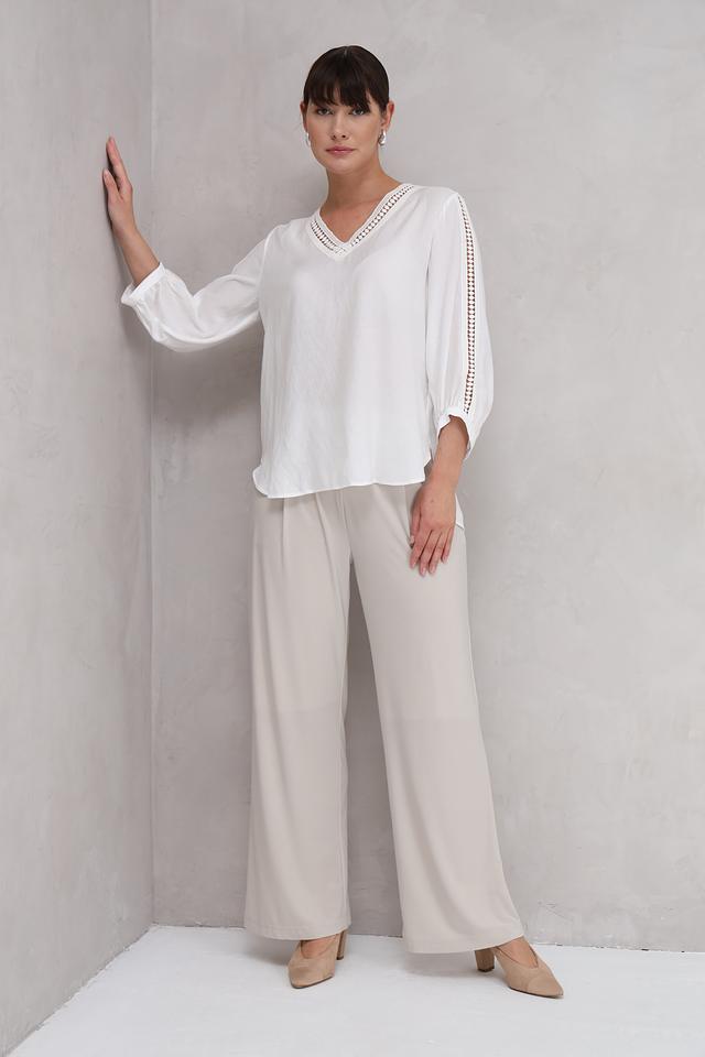 Блуза украшена изысканным кружевом по вырезу горловины и на рукавах, что придает ей особый шарм. V-образный вырез подчеркивает линию шеи и делает образ более открытым.