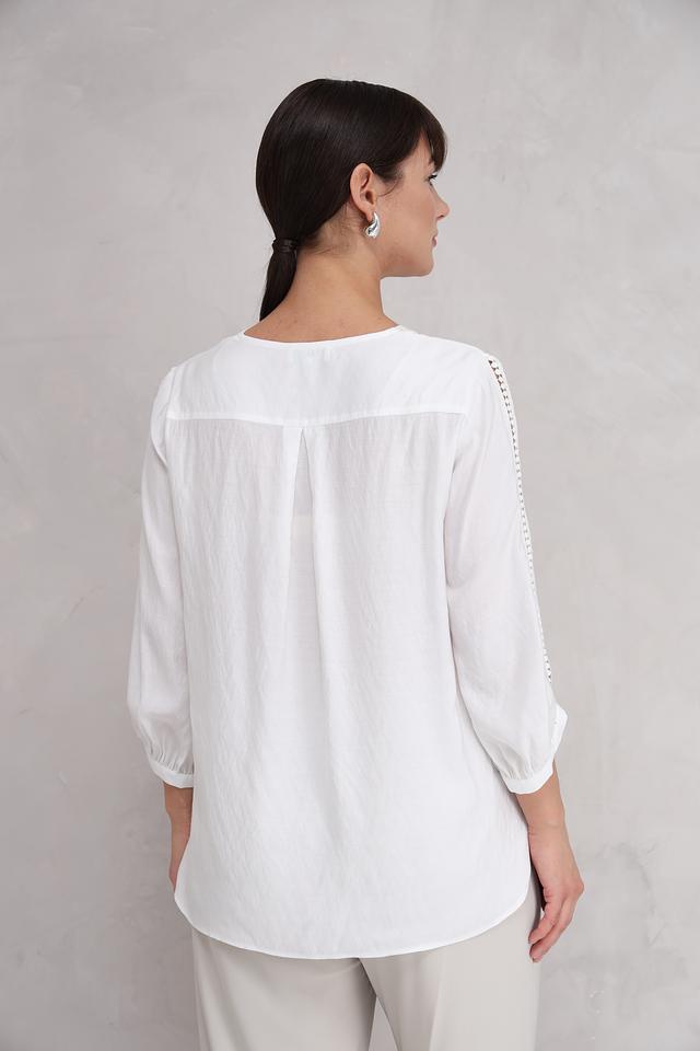Рукава блузы длиной 3/4 с кружевной отделкой добавляют образу романтичности. Свободный силуэт блузы позволяет сочетать ее с различными предметами гардероба, такими как брюки, юбки или джинсы.