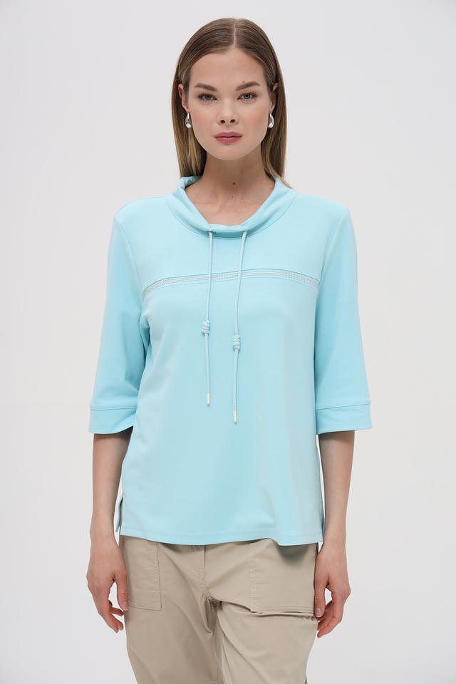 Блуза отличается оригинальным дизайном благодаря декоративной кулиске с белыми шнурками на горловине. Короткий рукав делает ее идеальной для теплой погоды. Изготовлена из сочетания вискозы, полиэстера и эластана, что обеспечивает мягкость, легкость и хорошую посадку.