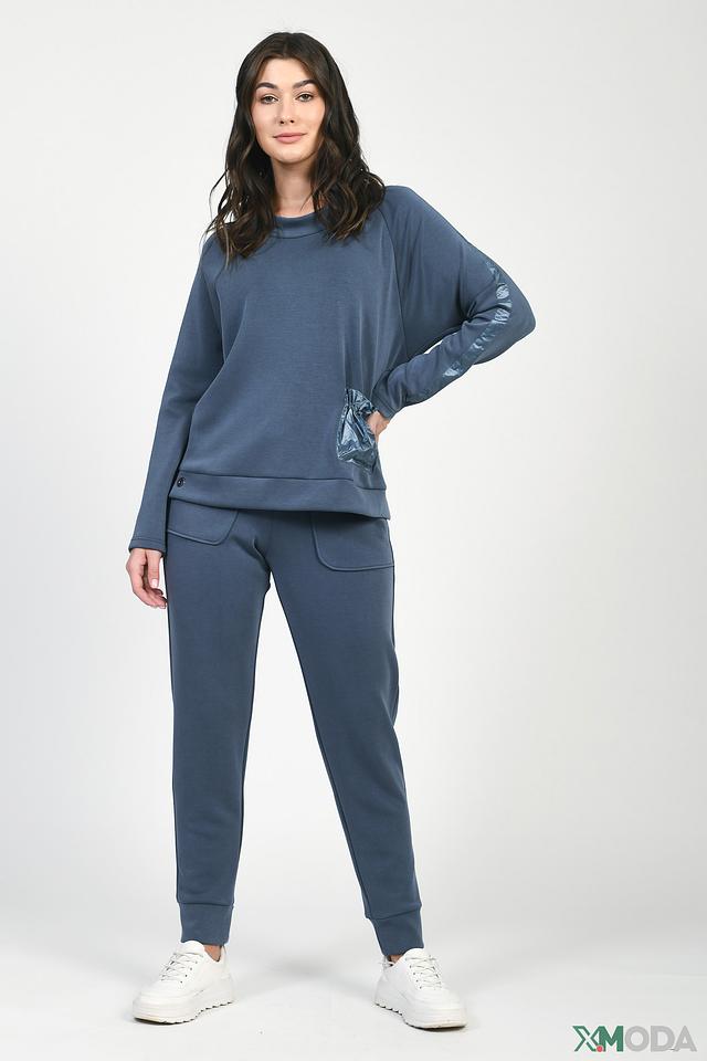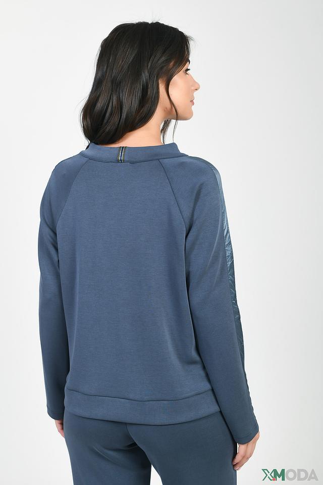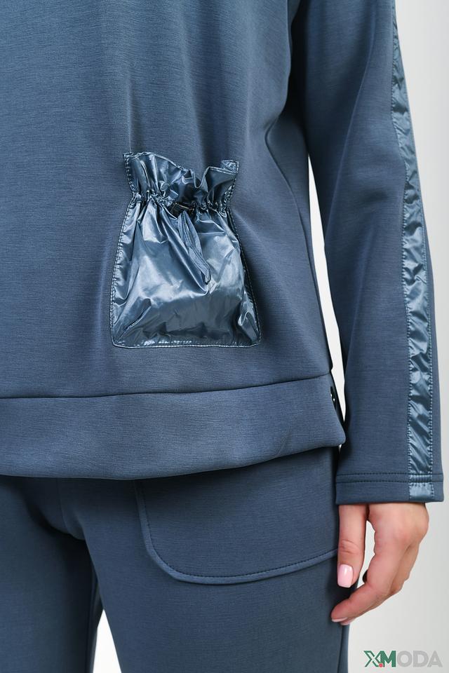 Основной цвет пуловера – синий, который прекрасно сочетается с различными оттенками. Оригинальные вставки из плащевой ткани на рукавах и кармане добавляют модели современный и стильный вид.