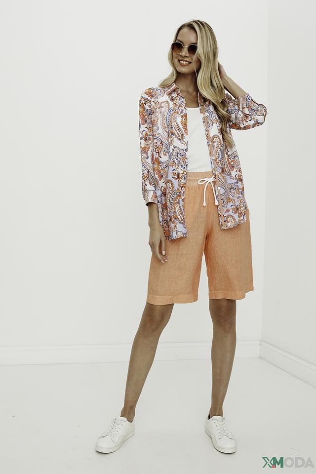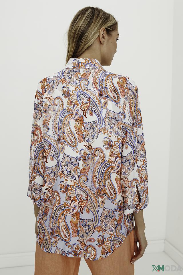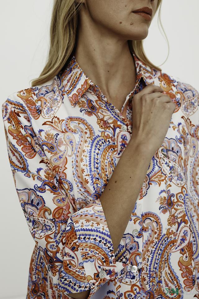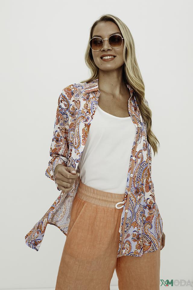 Рубашка имеет лёгкий, струящийся силуэт и выполнена в светлых тонах с ярким цветочным принтом, который придает ей особую изысканность. Модель с длинными рукавами и классическим воротником, застегивается на пуговицы по всей длине.