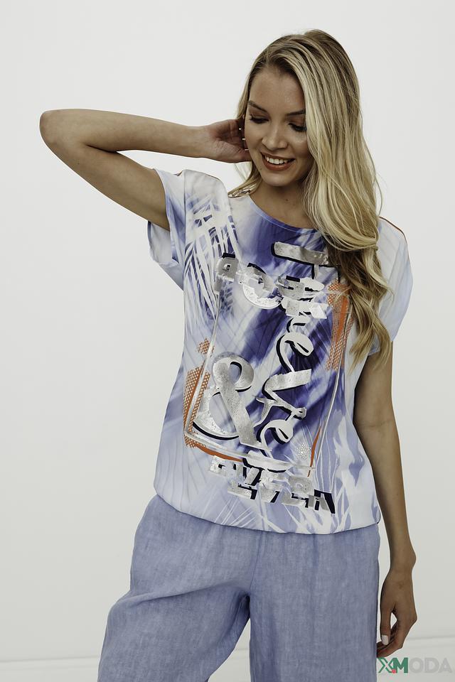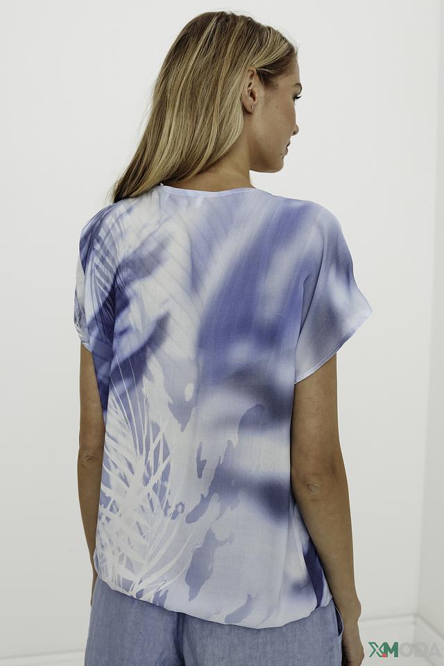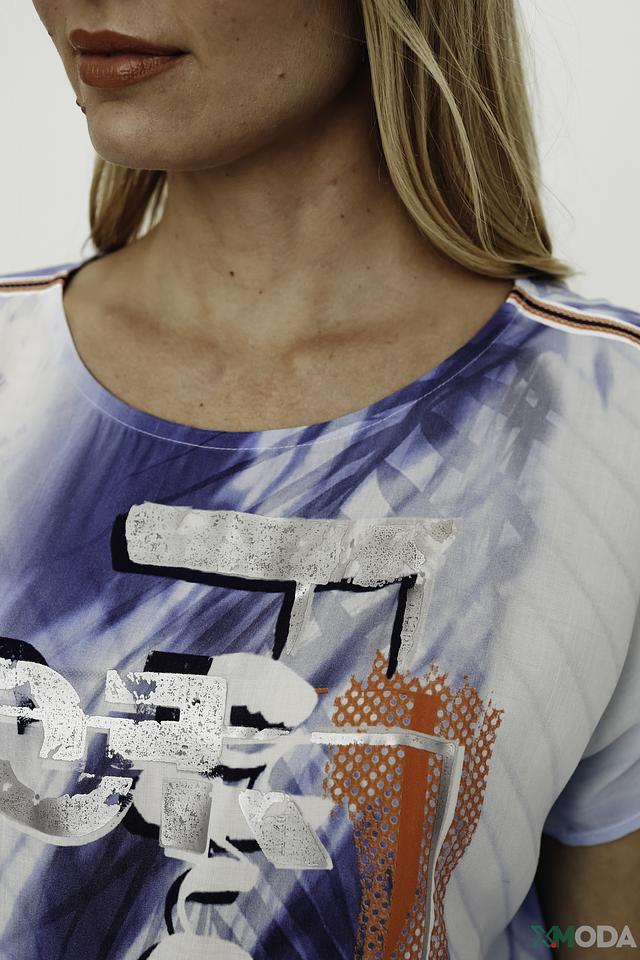 Блуза имеет свободный крой, короткие рукава и округлый вырез горловины. Главная особенность модели – эффектный абстрактный принт, сочетающий в себе различные оттенки голубого, серого и белого цветов, а также яркие вкрапления оранжевого и серебристого.