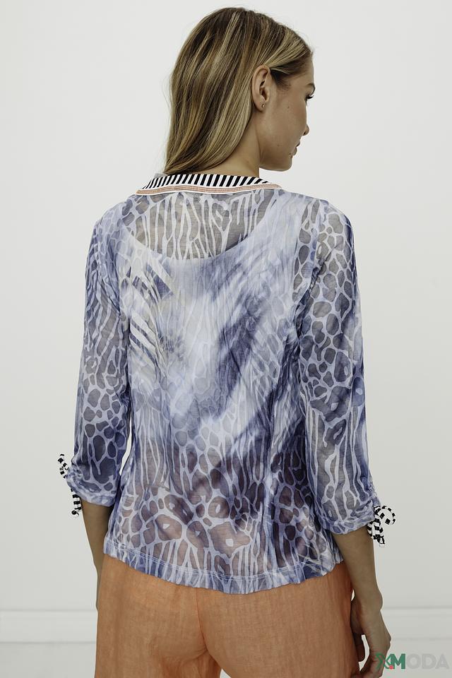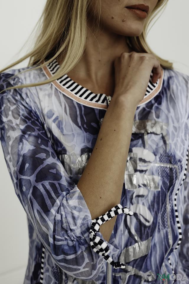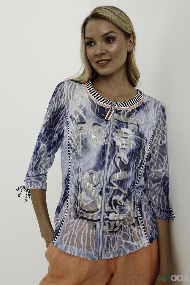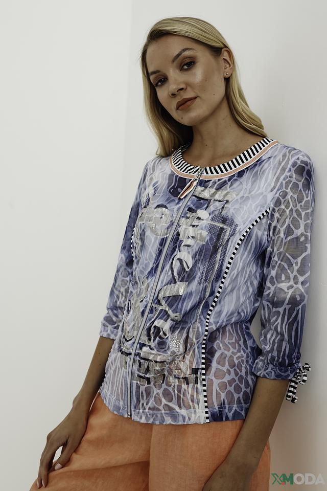 Женский жакет SE Stenau голубого цвета с оригинальным принтом и застежкой-молнией. Модель выполнена из сочетания полиэстера и хлопка, имеет ¾ рукава и декоративную отделку. Состав: полиэстер 65%, хлопок 35%