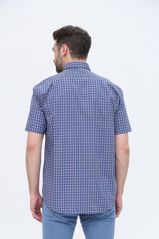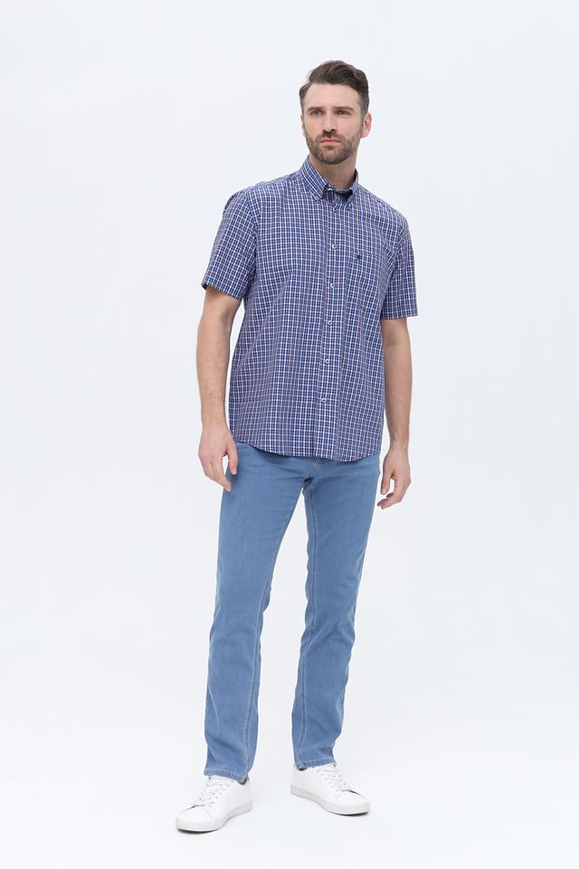 Рубашка имеет короткий рукав и стандартный крой (Regular fit), что обеспечивает комфортную посадку по фигуре. Воротник рубашки выполнен в классическом стиле.