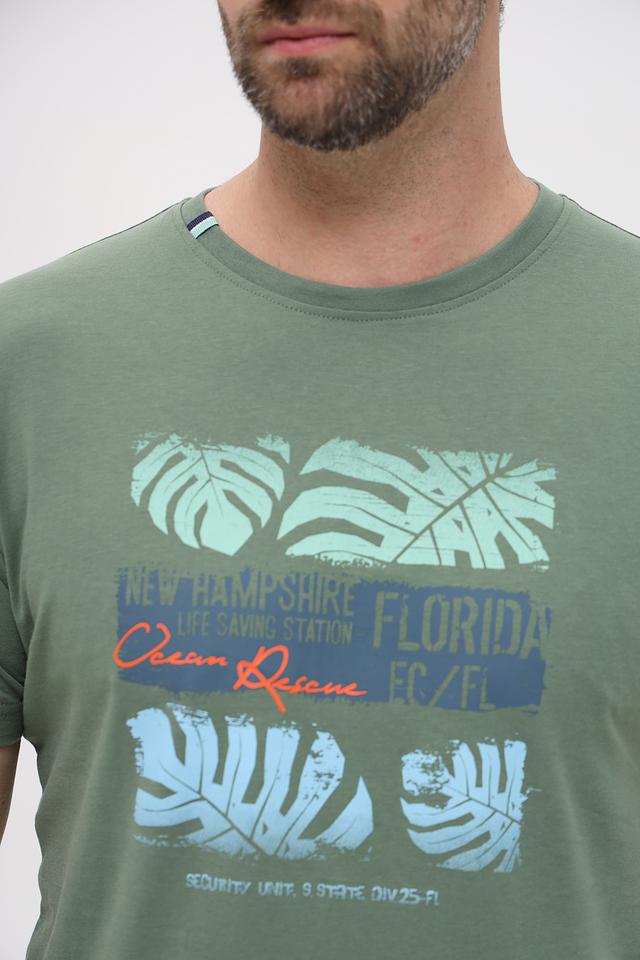 Эта стильная футболка от Sea Barrier станет отличным дополнением к вашему гардеробу. Она выполнена в приятном хаки цвете и украшена оригинальным принтом с изображением пальмовых листьев, надписями "NEW HAMPSHIRE", "FLORIDA" и "Ocean Rescue".