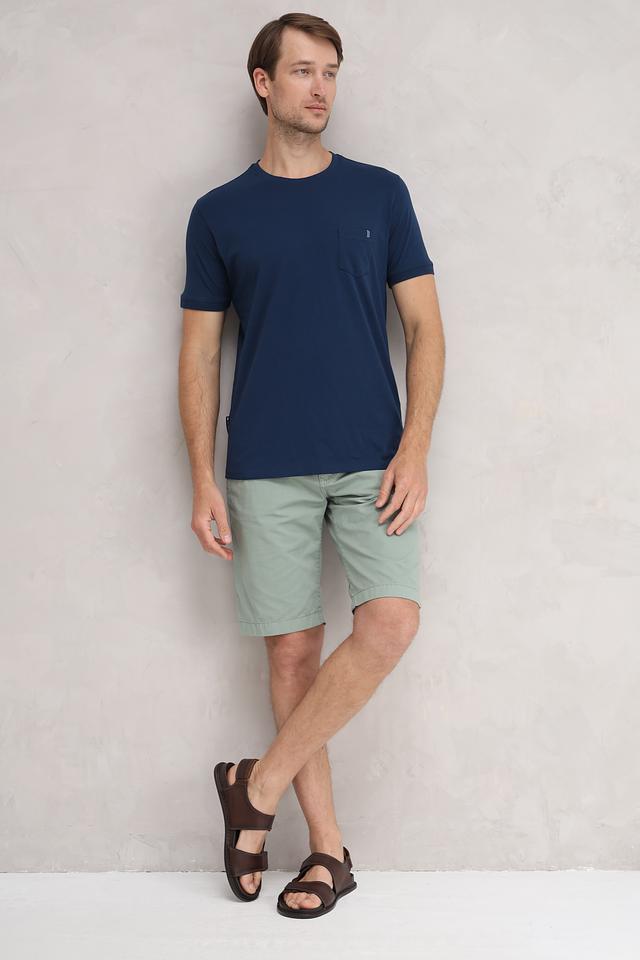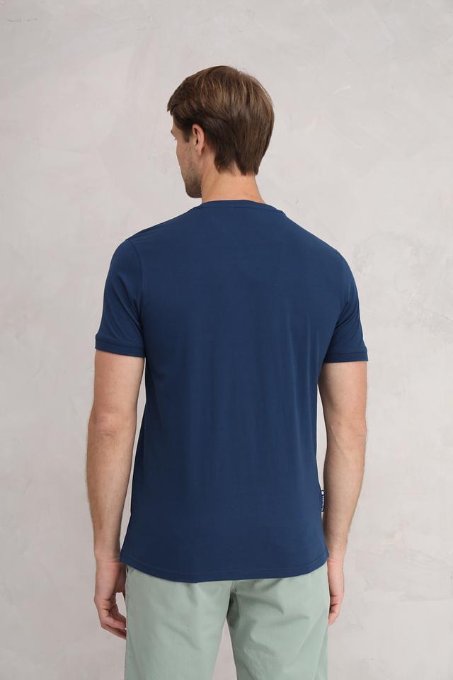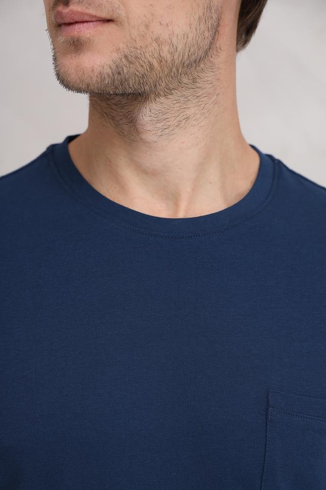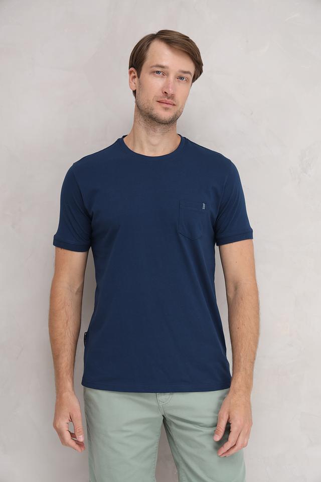 Модель отличается лаконичным дизайном: круглый вырез горловины, короткие рукава и небольшой нагрудный карман. Цвет футболки – насыщенный синий, который легко сочетается с различными элементами гардероба.