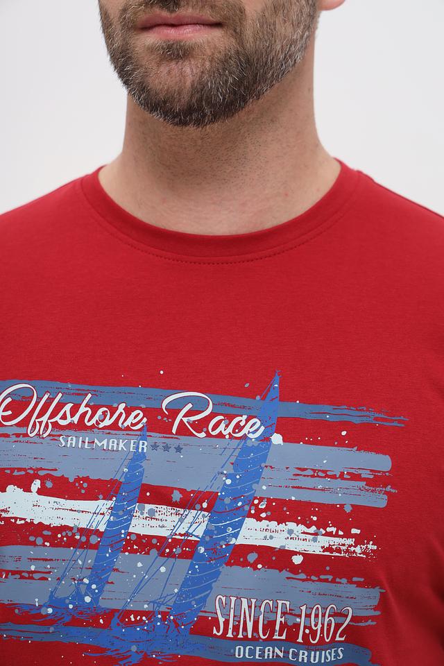 Основной цвет футболки – насыщенный красный, который привлекает внимание и подчеркивает индивидуальность. На передней части изделия расположен оригинальный принт с морской тематикой, выполненный в сочетании синих и белых оттенков. Принт добавляет футболке динамичности и стиля.