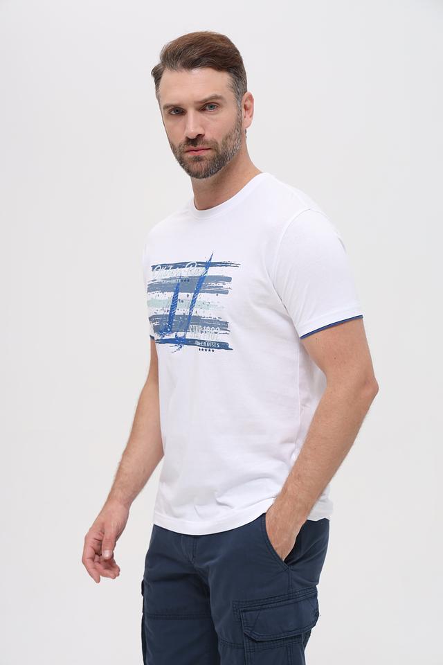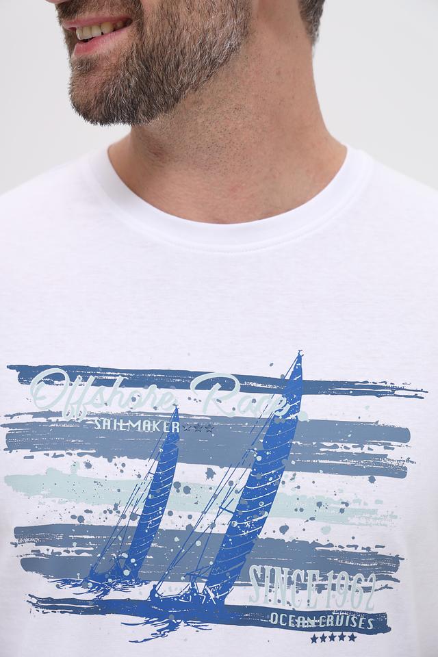 Белая футболка Sea Barrier с ярким морским принтом и синей отделкой горловины и рукавов. Изготовлена из 100% хлопка, обеспечивая комфорт и воздухопроницаемость. Стильный и удобный выбор для повседневной носки. Состав: хлопок 100%