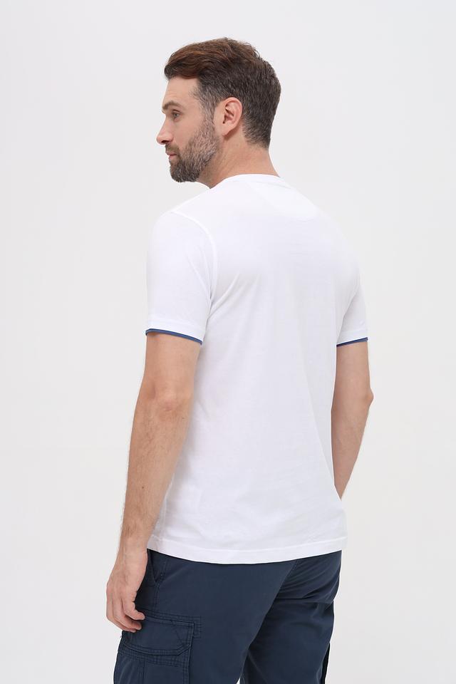 Отделка горловины и рукавов выполнена в синем цвете, что создает контрастный и стильный акцент. Футболка имеет классический прямой крой, который подходит для любого типа фигуры. Она идеально сочетается с джинсами, шортами или спортивными брюками.