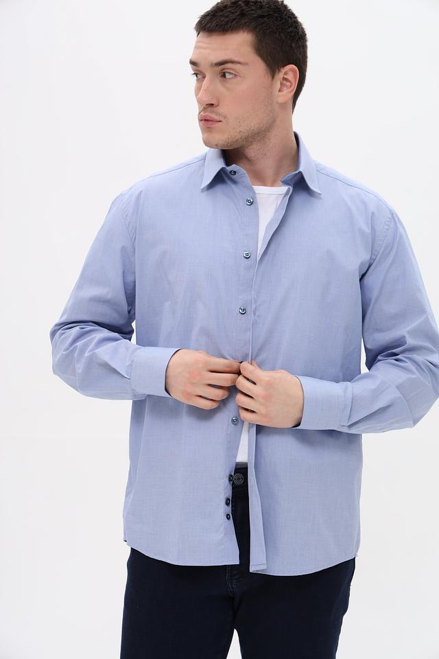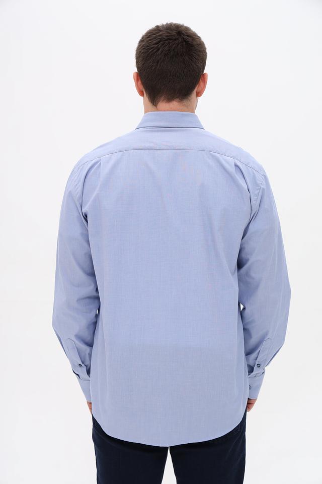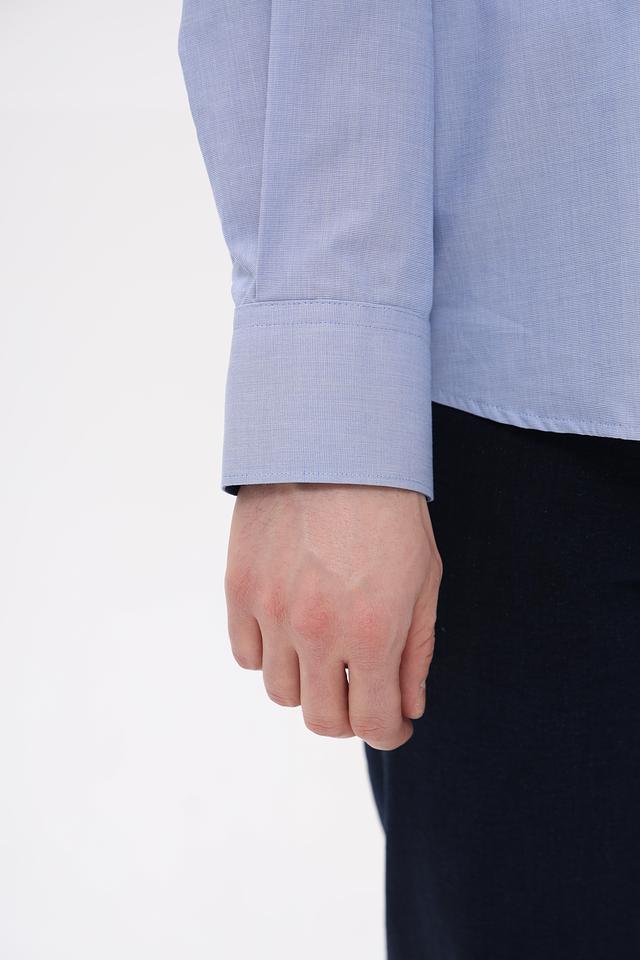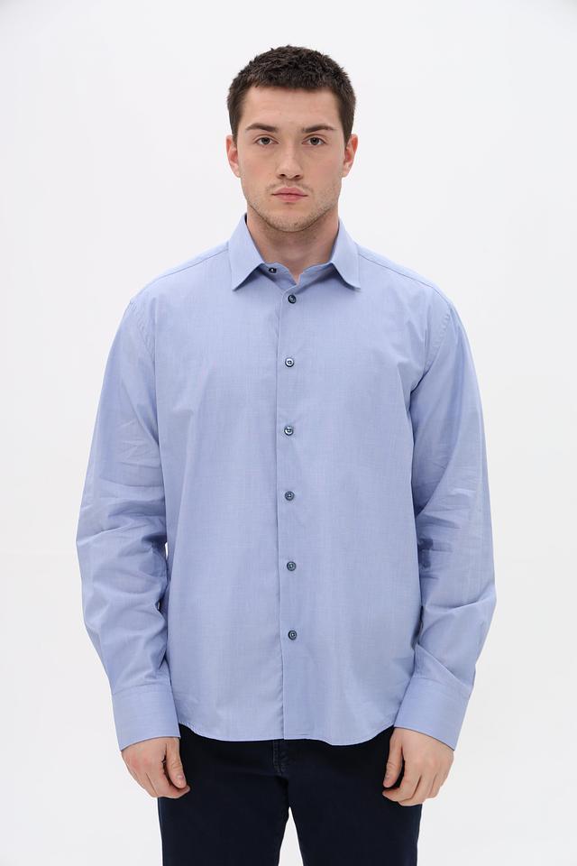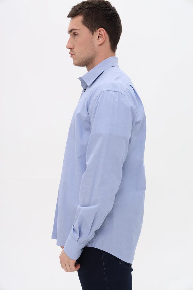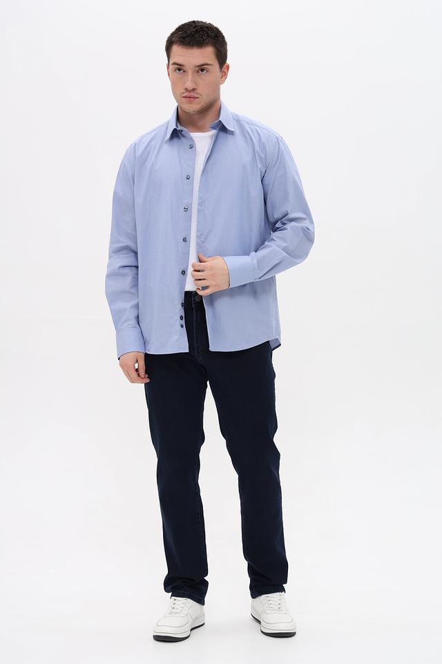 Рубашка имеет классический крой с длинными рукавами и стандартной посадкой. Застежка на пуговицах по всей длине, манжеты на пуговицах. Воротник рубашки классической формы.