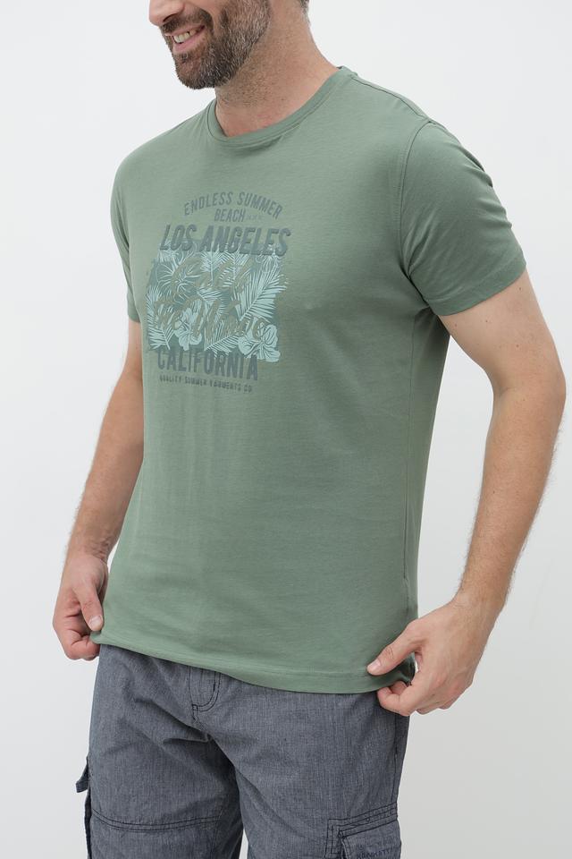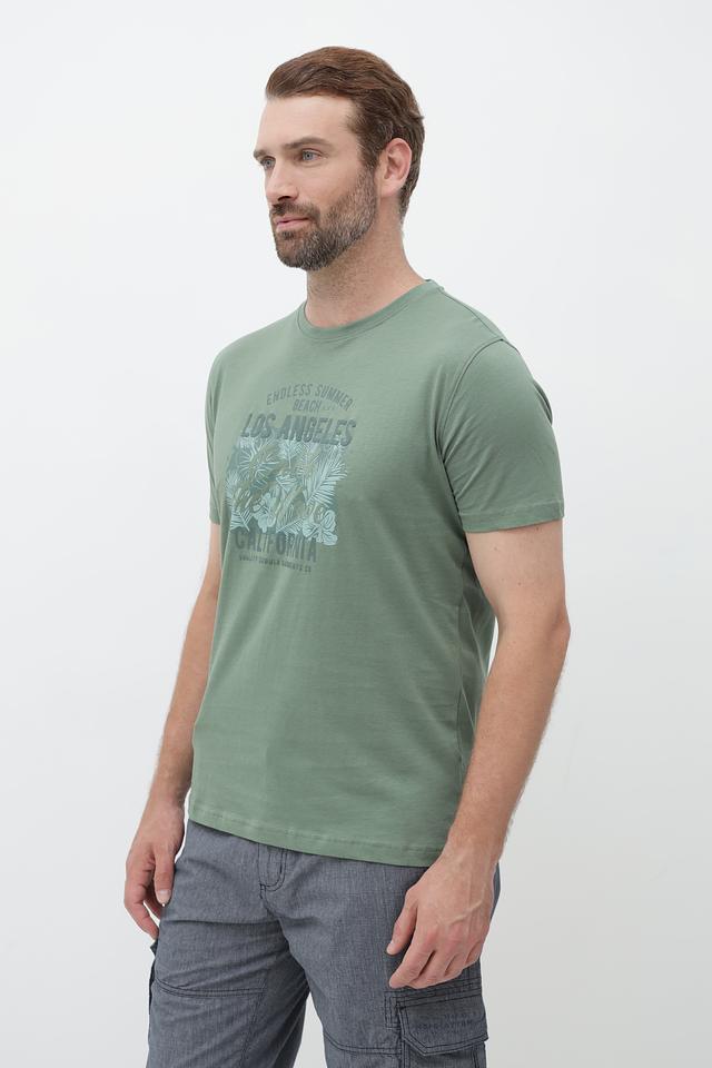 Основным акцентом является яркий принт на груди, изображающий пальмы и надпись "Endless Summer Los Angeles California". Принт выполнен в приглушенных тонах, гармонично сочетающихся с основным цветом футболки.
