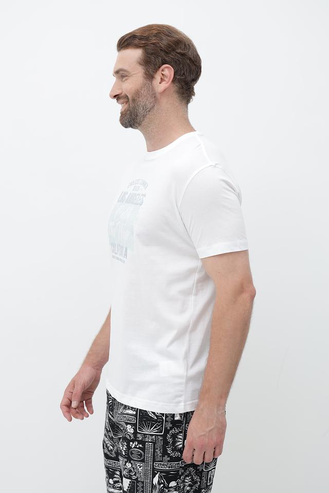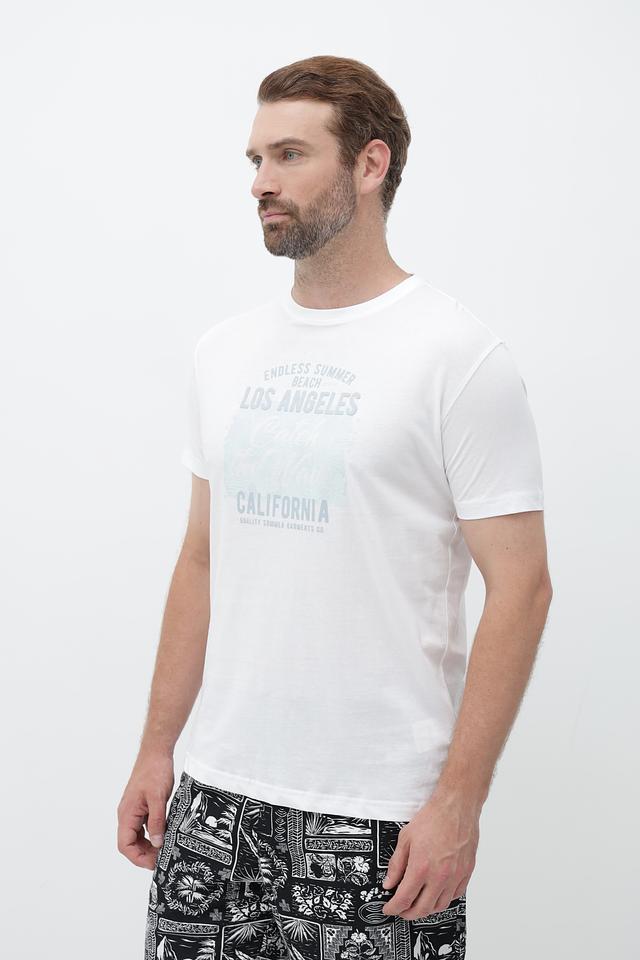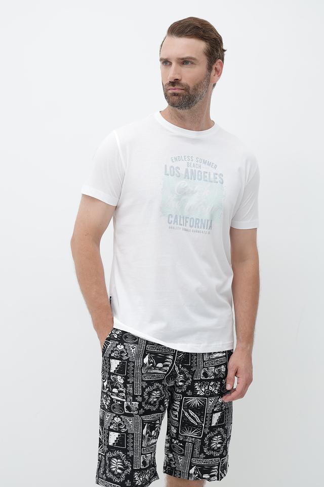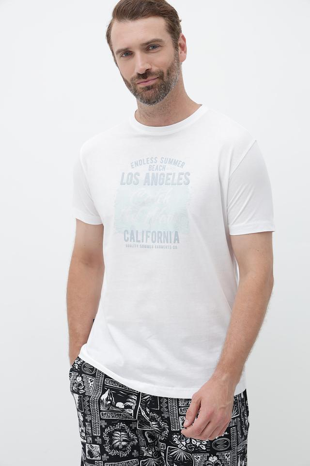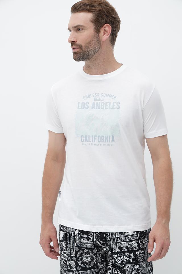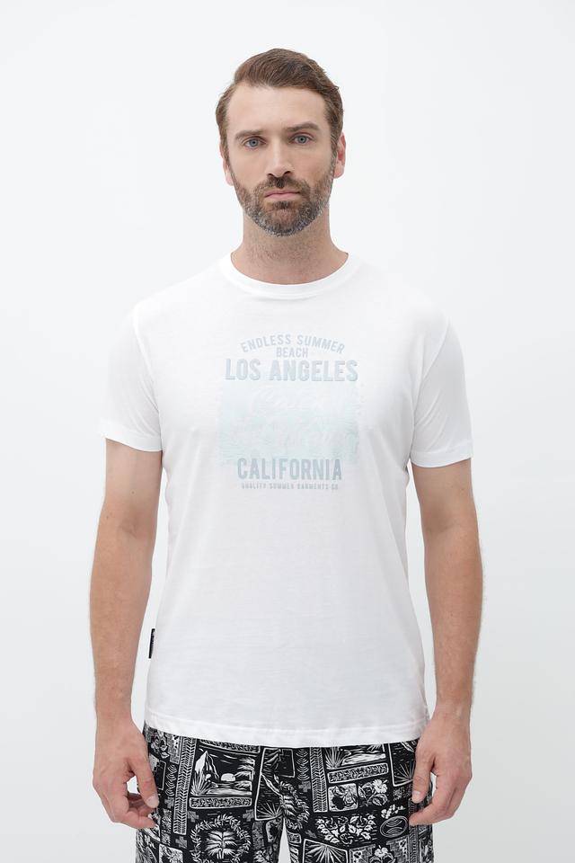 Футболка имеет классический прямой крой и короткий рукав. Главная особенность модели – стильный принт с надписями "Endless Summer Beach Los Angeles California", выполненный в светло-зелёных тонах. Этот принт придаёт футболке лёгкий и непринуждённый вид, идеально подходящий для летних прогулок и отдыха.