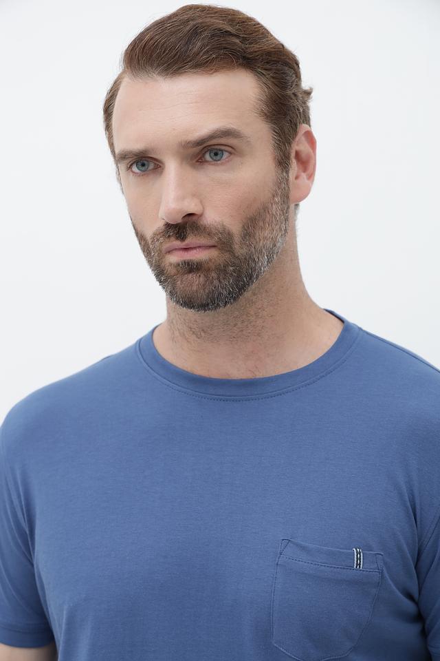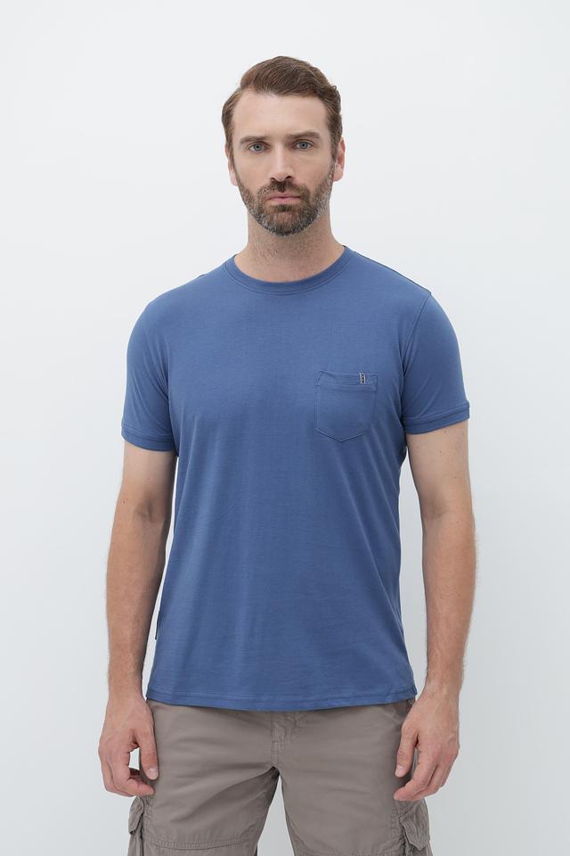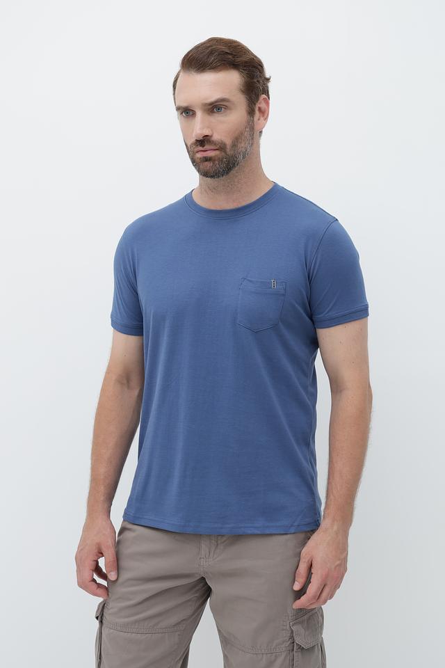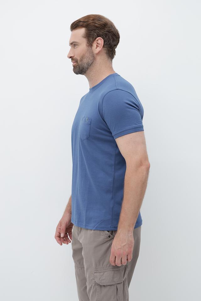 Футболка имеет классический крой, короткий рукав и круглый вырез горловины. Нагрудный карман добавляет функциональности и стиля. Голубой цвет делает эту модель универсальной и легко сочетаемой с различными элементами одежды.