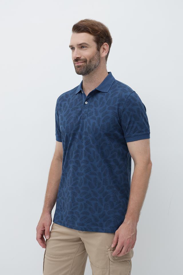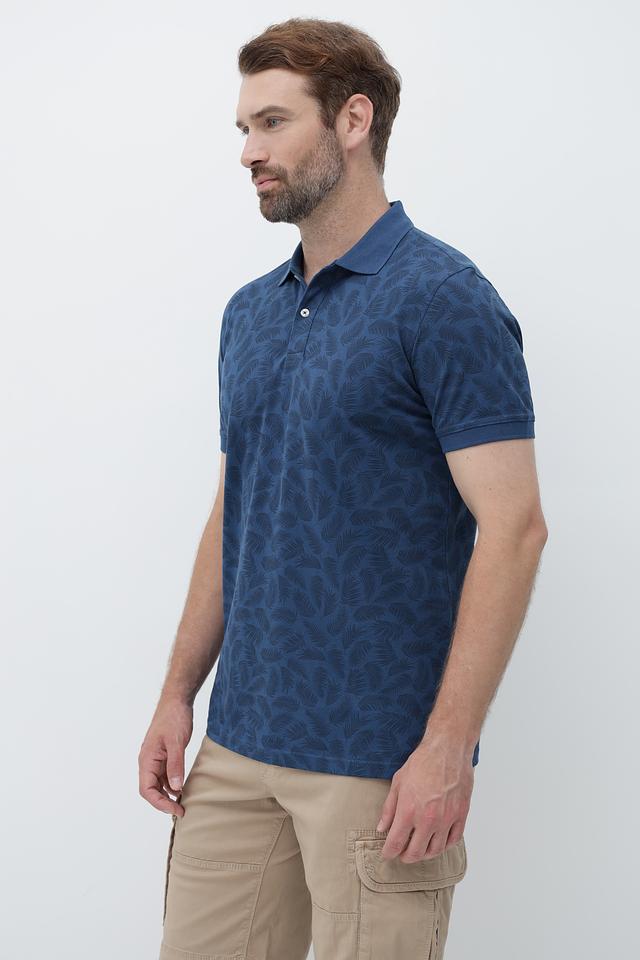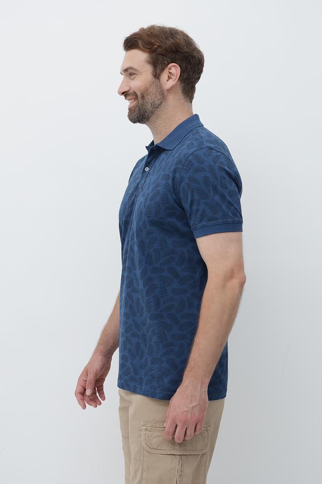 Поло имеет классический крой с короткими рукавами и воротником-поло на пуговицах. Отличительной особенностью данной модели является оригинальный синий цвет и стильный узор из листьев, который придаёт ей индивидуальность.
