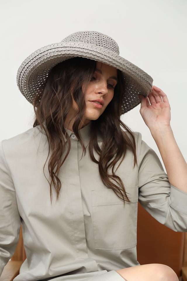 Широкие поля шляпы надежно защищают лицо и шею от прямых солнечных лучей. Светло-серый цвет шляпы универсален и легко сочетается с различными нарядами. Плотная структура плетения придает шляпе форму и долговечность.