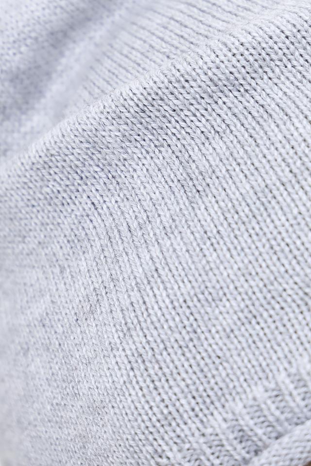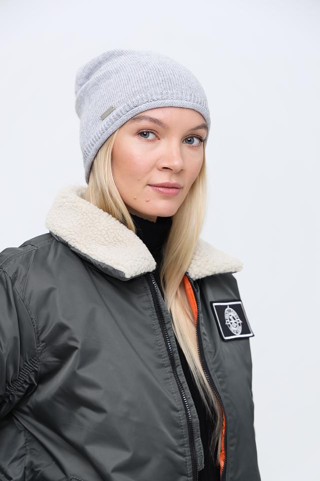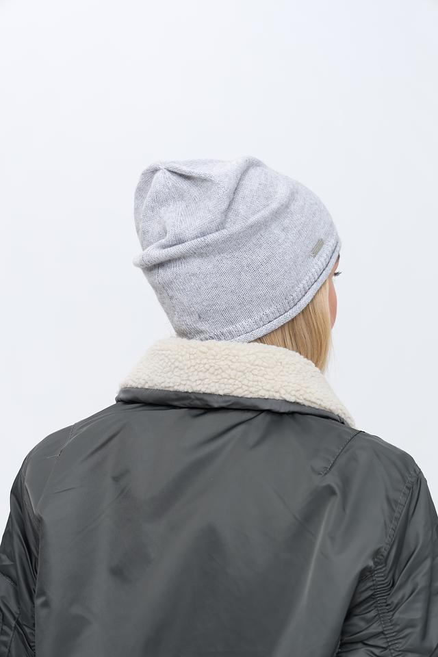 Шапка имеет классический дизайн и нейтральный серый цвет, который легко сочетается с различными стилями одежды. Текстура вязаного полотна добавляет шапке уютный вид.