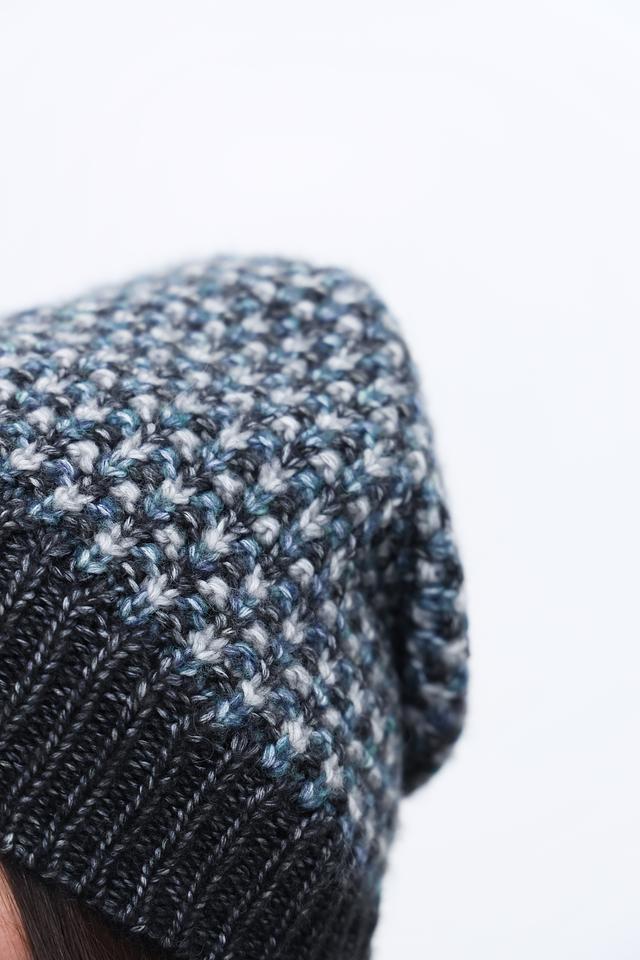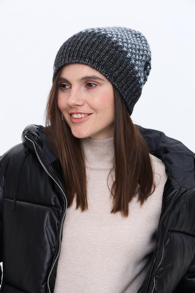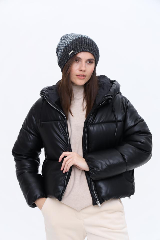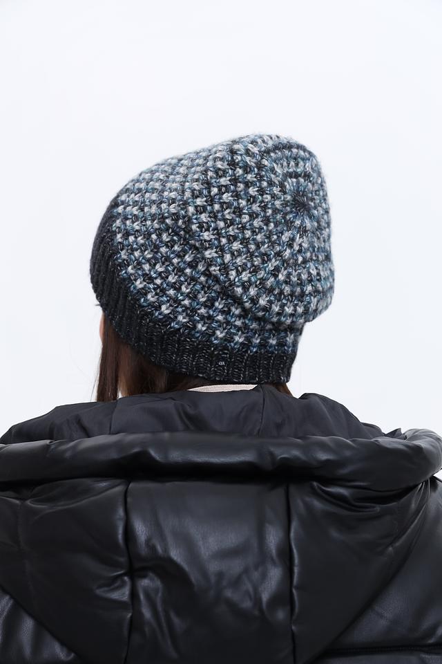 Вязаная текстура шапки придает ей стильный и современный вид. Преобладающий серый цвет с вкраплениями белых и голубых нитей делает её универсальной и легко сочетаемой с различными элементами гардероба.