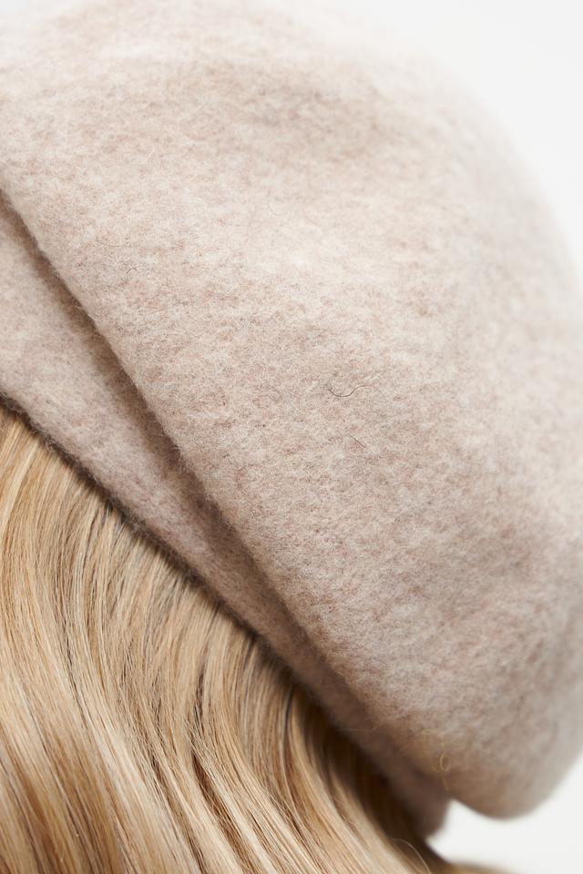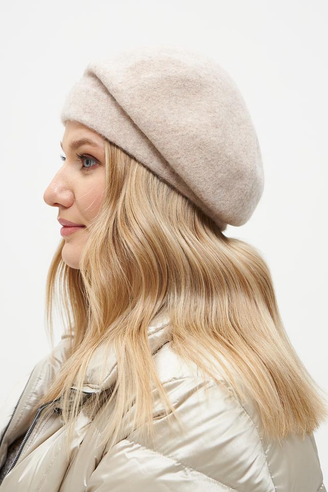 Берет имеет классическую форму и нейтральный бежевый цвет, который легко сочетается с различными элементами одежды. Мягкая текстура шерсти приятна на ощупь и не вызывает раздражения.