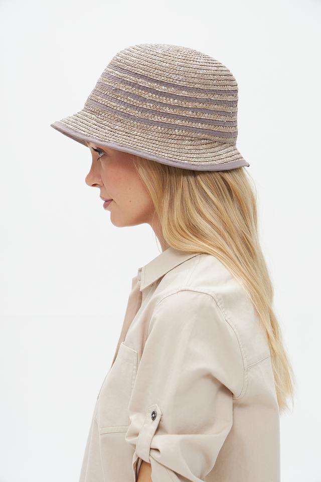 Шляпа имеет классическую форму с небольшими полями. Текстура плетения из соломы придает ей естественный вид. Отличительной особенностью является сочетание бежевых и серых оттенков в плетении, что делает её интересным акцентом в вашем гардеробе.