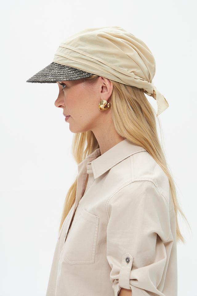 Кепка выполнена в нежном бежевом цвете, который легко сочетается с различными нарядами. Козырек выполнен из плетеного материала, что придает модели особый шарм. Завязки позволяют регулировать посадку кепки, обеспечивая комфорт при носке.