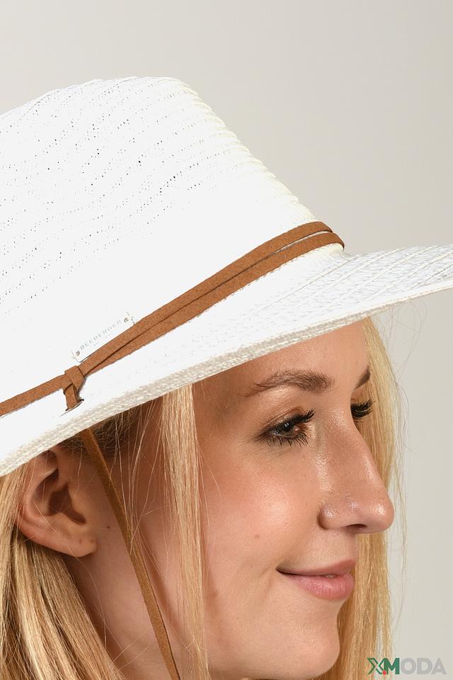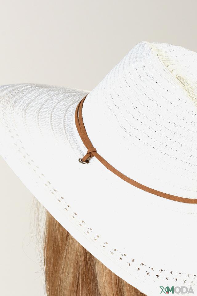 Белый цвет шляпы универсален и легко сочетается с любой одеждой. Коричневая лента вокруг тульи добавляет изысканности и подчеркивает стиль. Шляпа имеет широкие поля, которые обеспечивают надежную защиту от солнца.