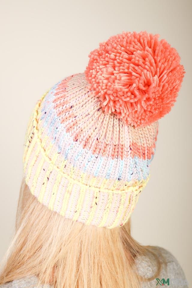 Дизайн шапки дополнен крупным помпоном нежно-розового цвета, который придает ей игривый и женственный вид. Шапка имеет удобную посадку и не стесняет движений. Многоцветный узор в пастельных тонах делает эту шапку уникальной и привлекательной.